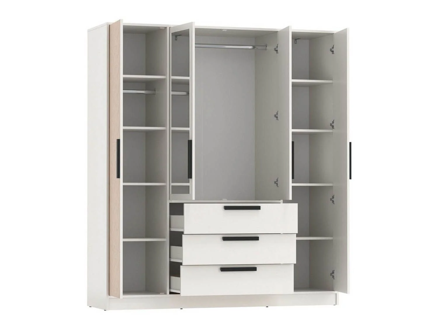 Внутри секции с полками и горизонтальной штангой для плечиков с одеждой.