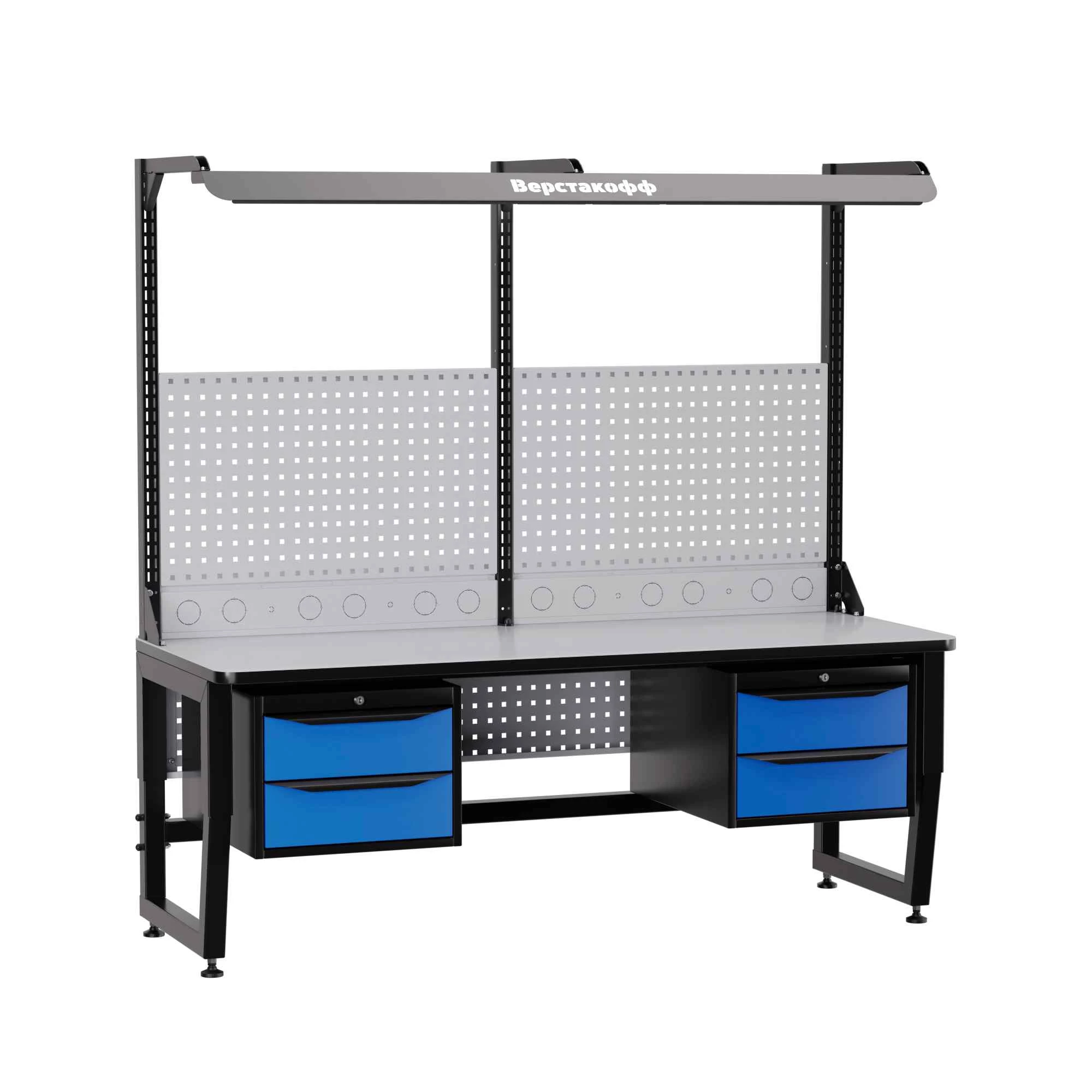 Для наилучшей освещенности при работе с мелкими электронными компонентами рабочее место комплектуется блоком освещения. В его составе — специальный промышленный светильник с необходимой цветовой температурой и световым потоком, обеспечивающим оптимальные условия работы. Блок освещения располагается над рабочей поверхностью на регулируемых (по высоте и по вылету) кронштейнах