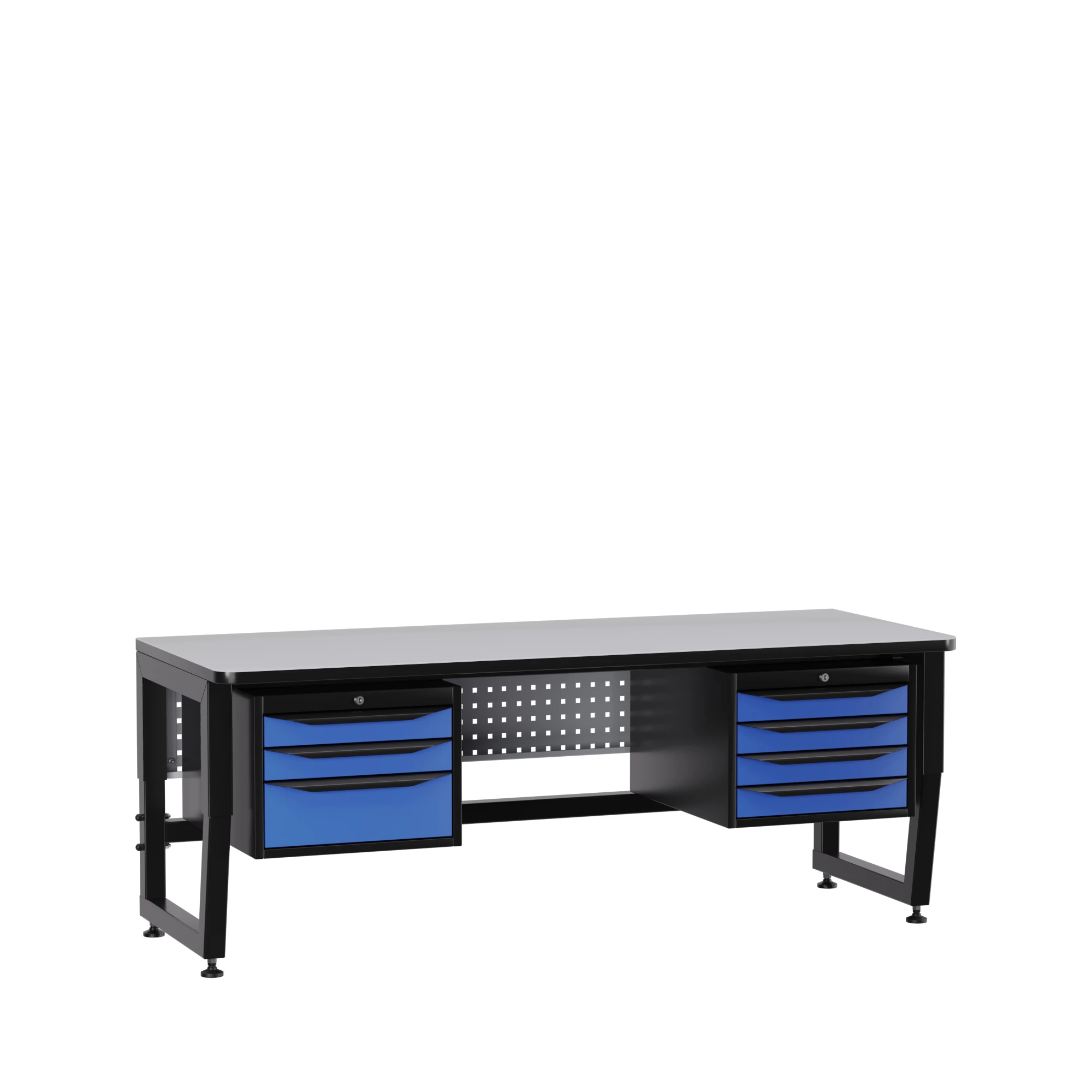 Несущая конструкция стола – это промышленный ESD каркас. Сочетание опорных, несущих и усиливающих элементов из металла, обеспечивают высокую надежность конструкции при интенсивной промышленной эксплуатации с распределенными нагрузками на рабочее место до 500 кг. Регулируемые опоры с возможностью плавной регулировки по высоте позволяют установить удобную высоту рабочей поверхности от 700мм до 850мм. Специальное ESD полимерное покрытие элементов каркаса с сопротивлением 1 МОм обеспечивают антистатические свойства изделия