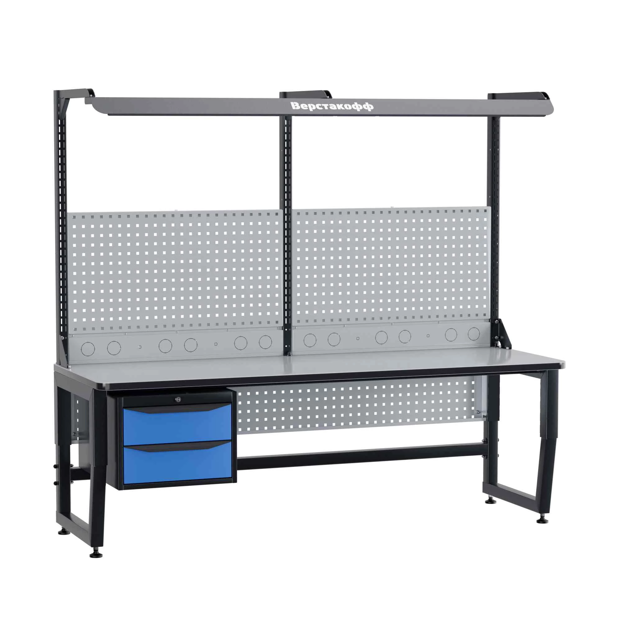 Для наилучшей освещенности при работе с мелкими электронными компонентами рабочее место комплектуется блоком освещения. В его составе — специальный промышленный светильник с необходимой цветовой температурой и световым потоком, обеспечивающим оптимальные условия работы. Блок освещения располагается над рабочей поверхностью на регулируемых (по высоте и по вылету) кронштейнах