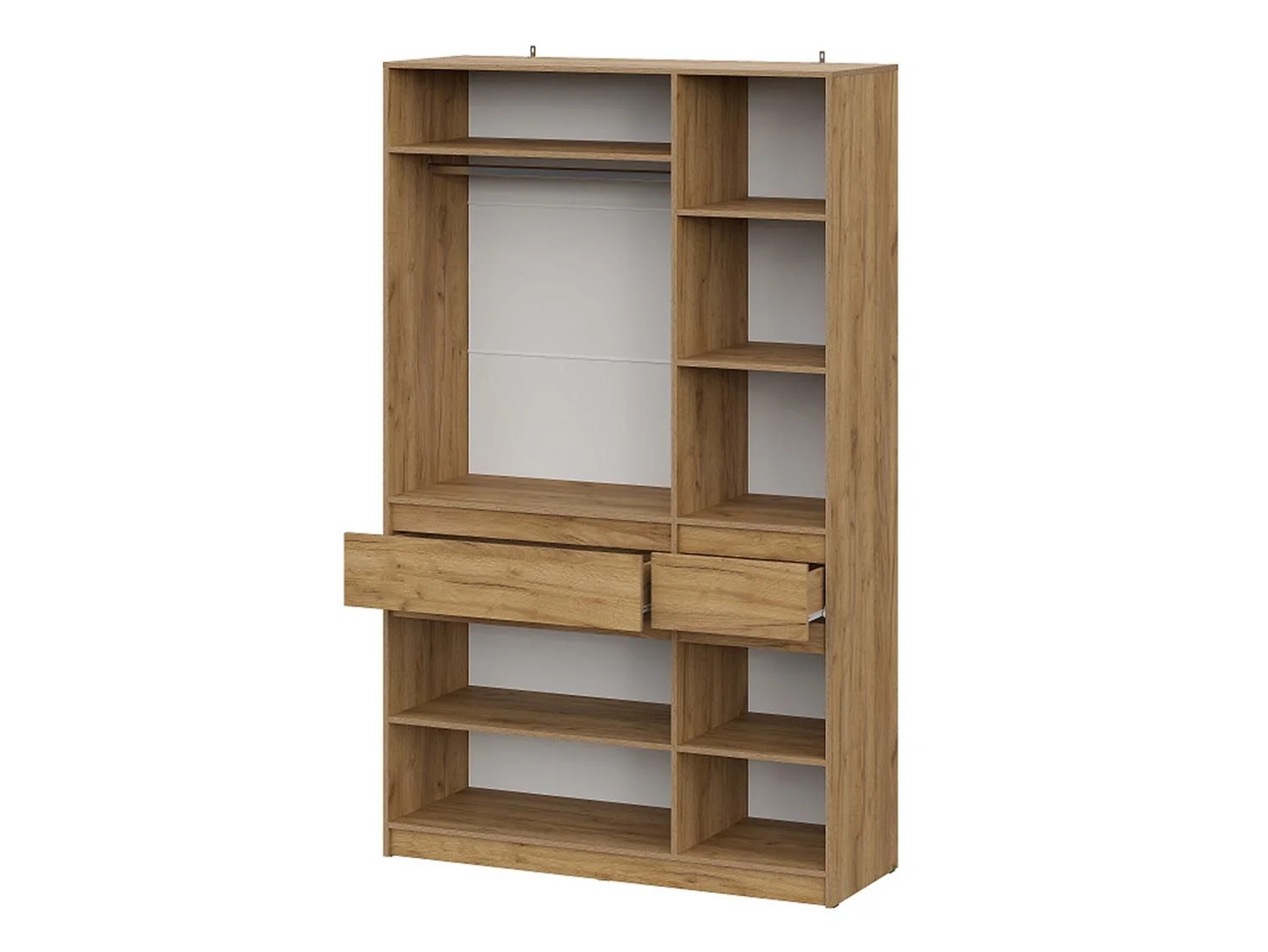 Внутри 8-мь полок для хранения, 2-а выдвижных ящика и отделение с горизонтальной штангой для плечиков.