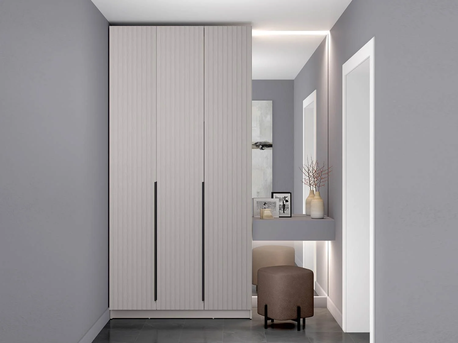 Внутри полки и горизонтальная штанга для плечиков с одеждой.