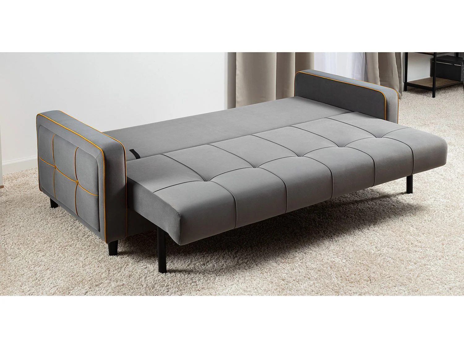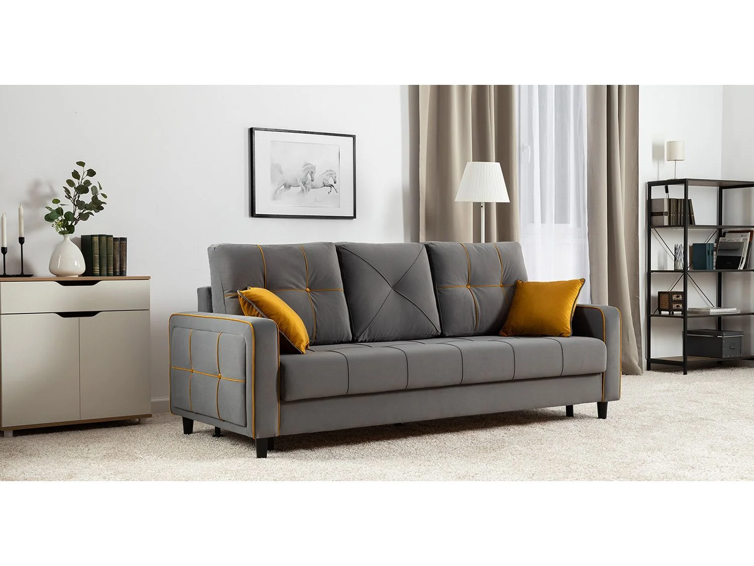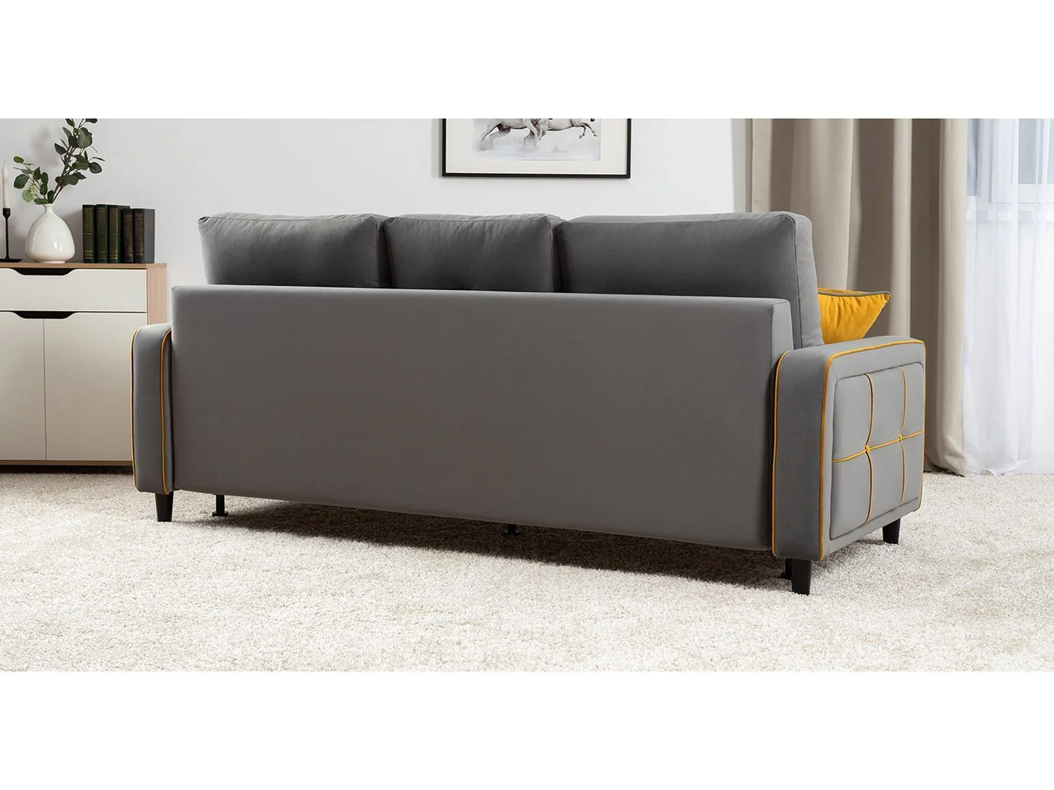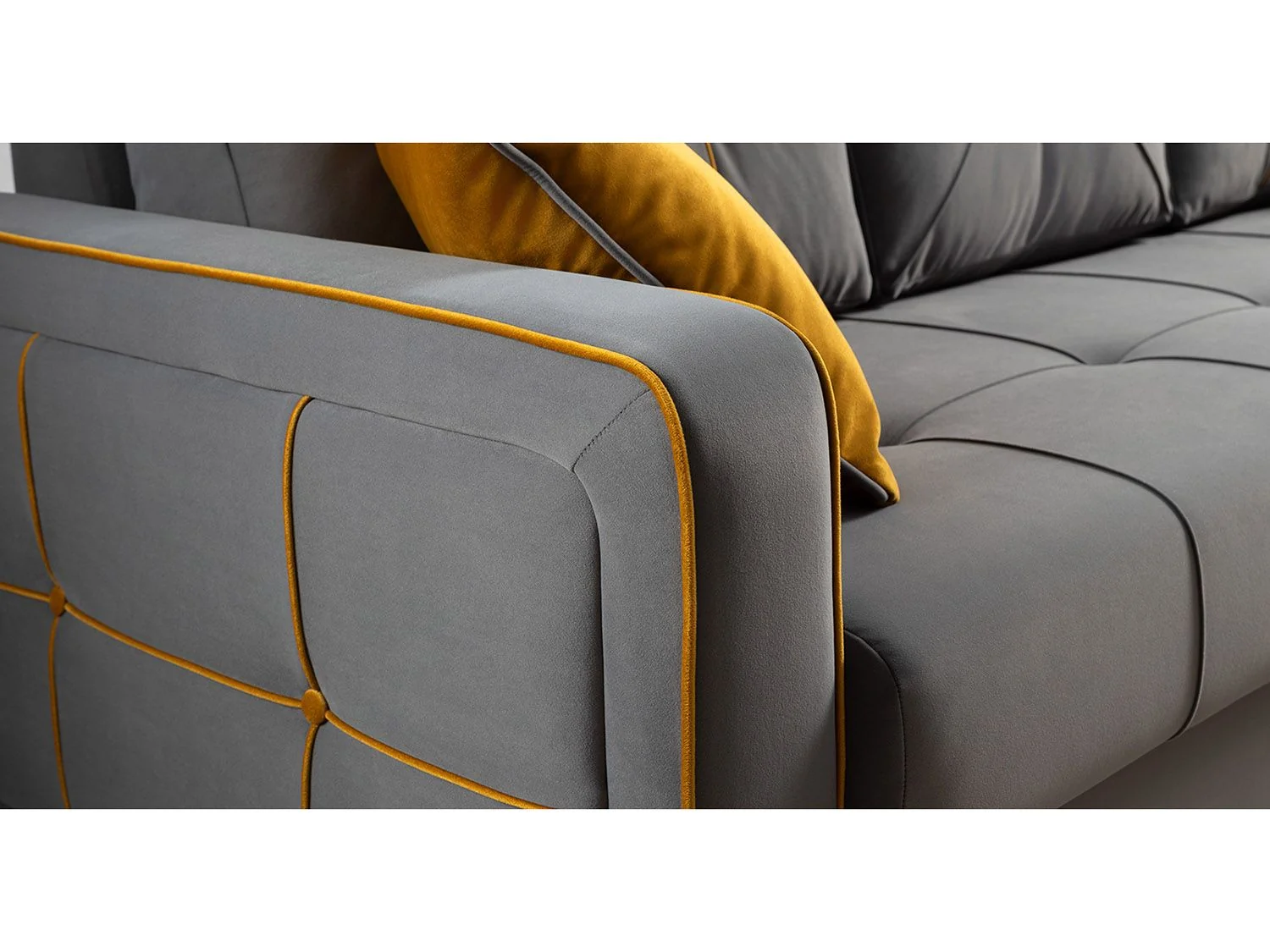 декор Декоративные канты на подушках и вставке подлокотников. Пуговицы в местах пересечения кантов на подушке и вставке подлокотников. По торцам подлокотников и думках контрастный декоративный кант. Защипы на сиденье и средней большой подушке.