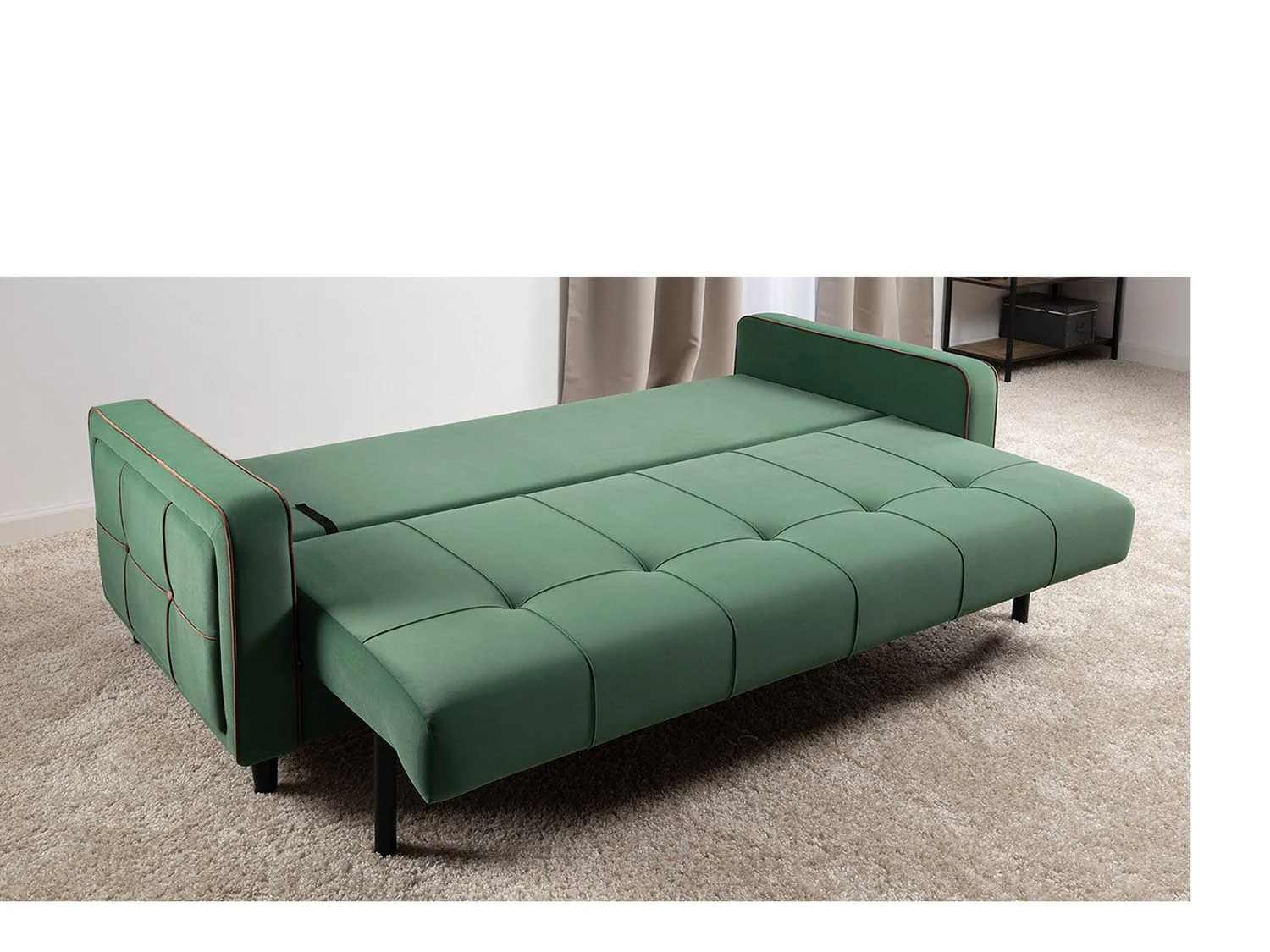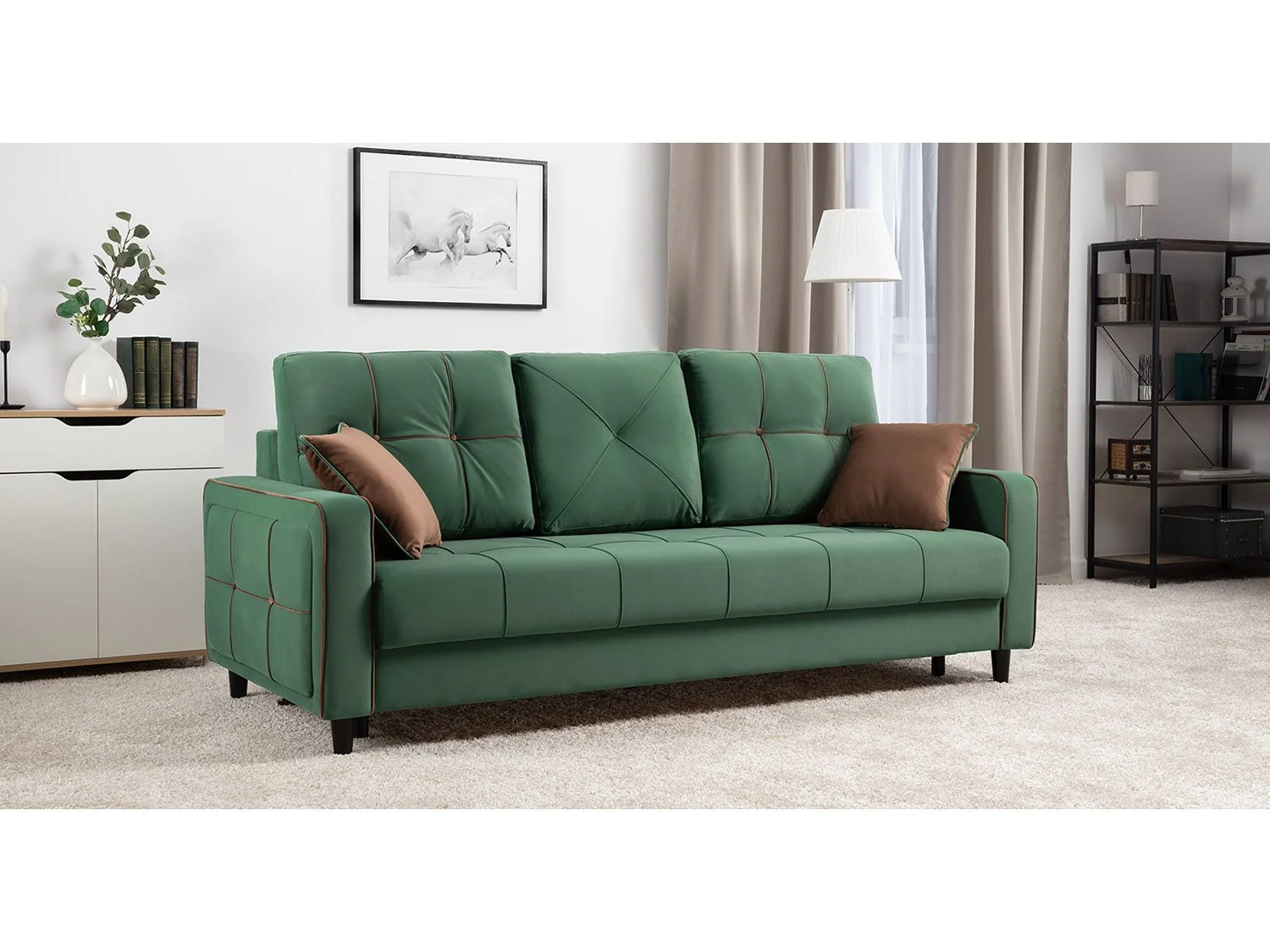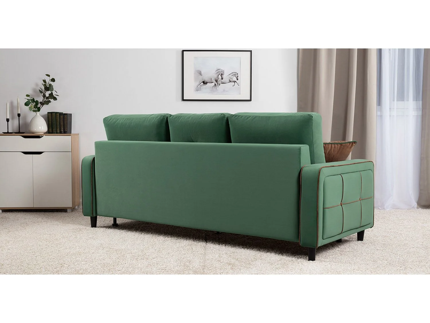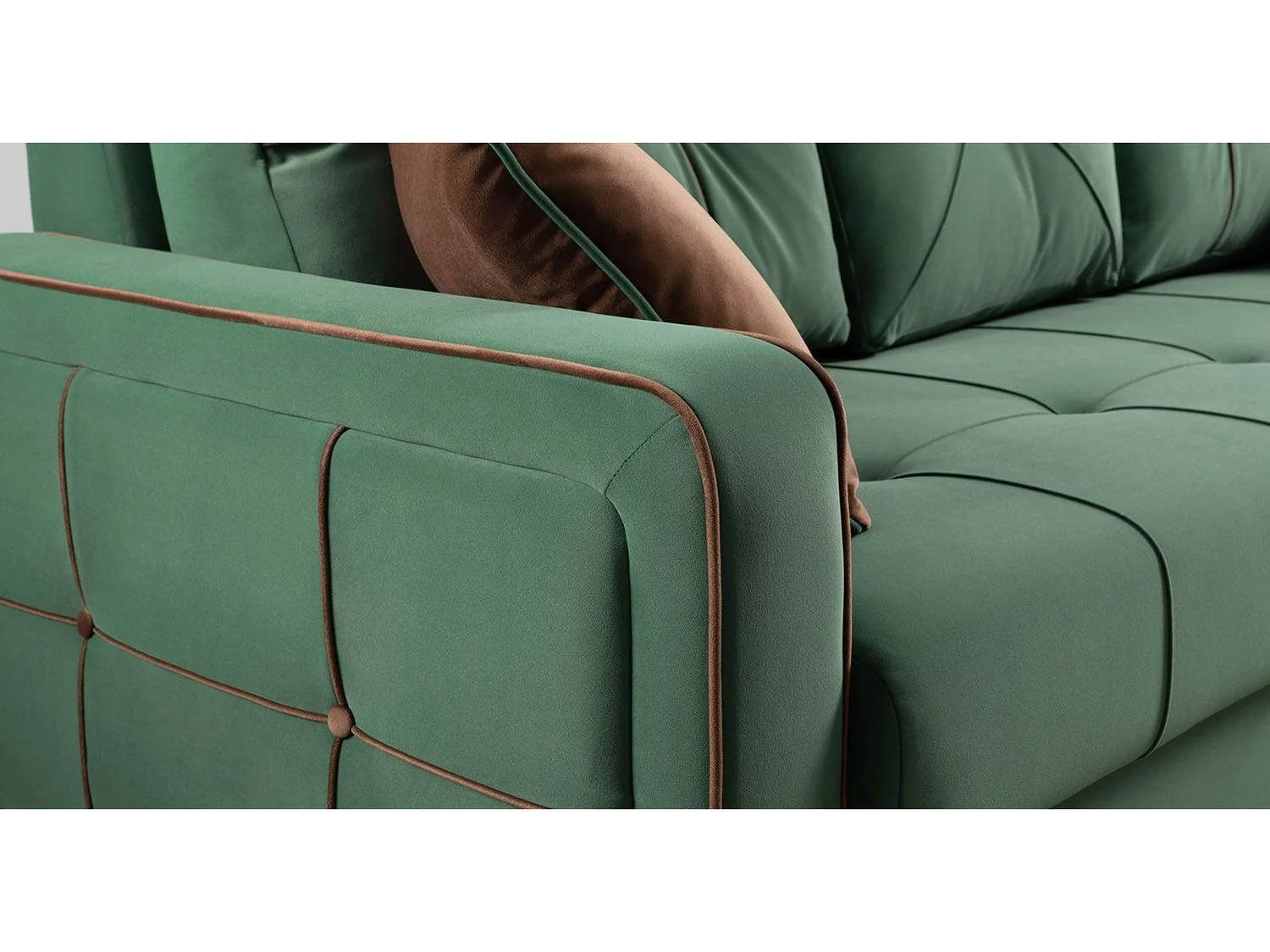 декор Декоративные канты на подушках и вставке подлокотников. Пуговицы в местах пересечения кантов на подушке и вставке подлокотников. По торцам подлокотников и думках контрастный декоративный кант. Защипы на сиденье и средней большой подушке.