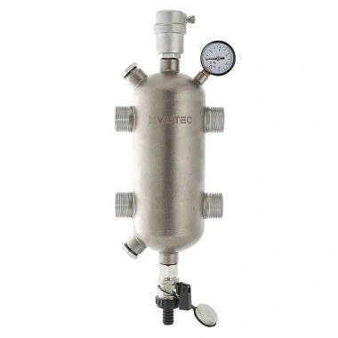 Гидравлическая стрелка из нержавеющей стали комплектуется манометром, дренажным клапаном, автоматическим воздухоотводчиком с отсекающим клапаном. На корпусе предусмотрены резьбовые патрубки для дополнительной установки датчика температуры, термометра, магнитного шламоуловителя. Патрубки заглушены резьбовыми пробками.
