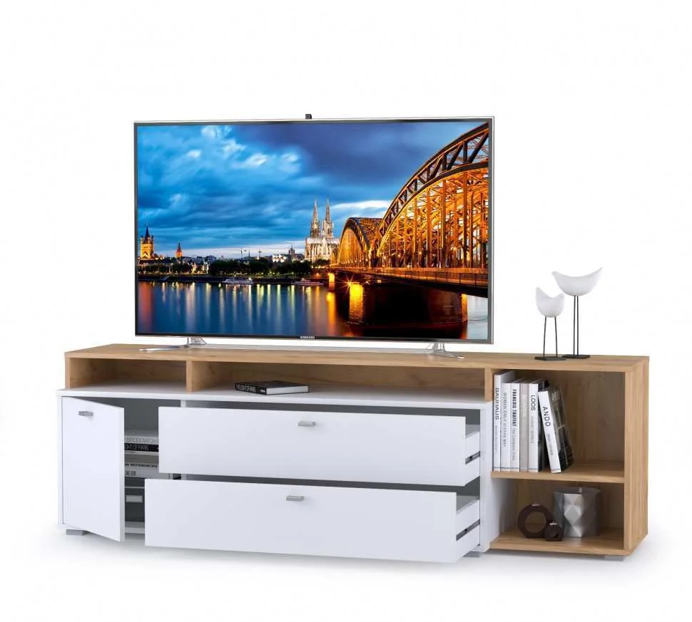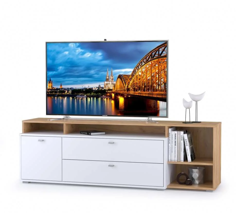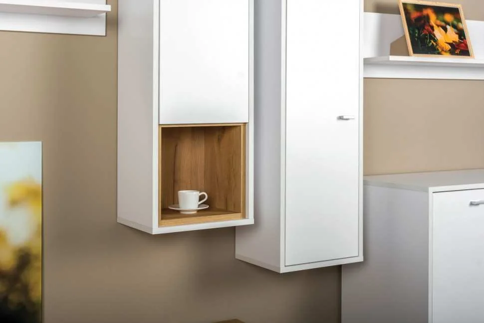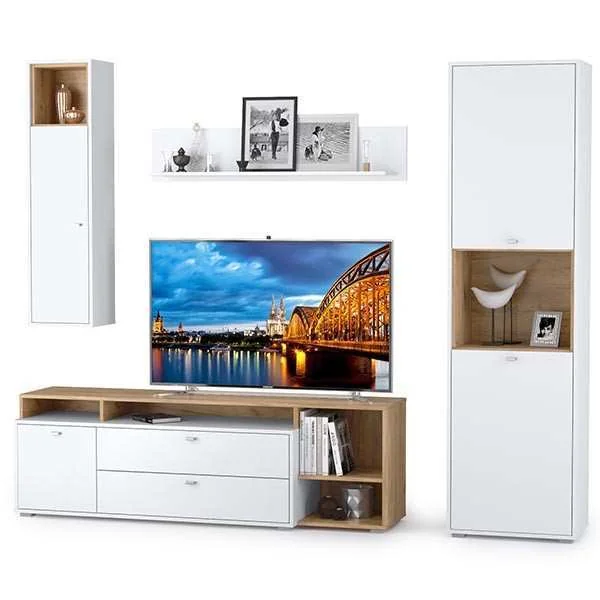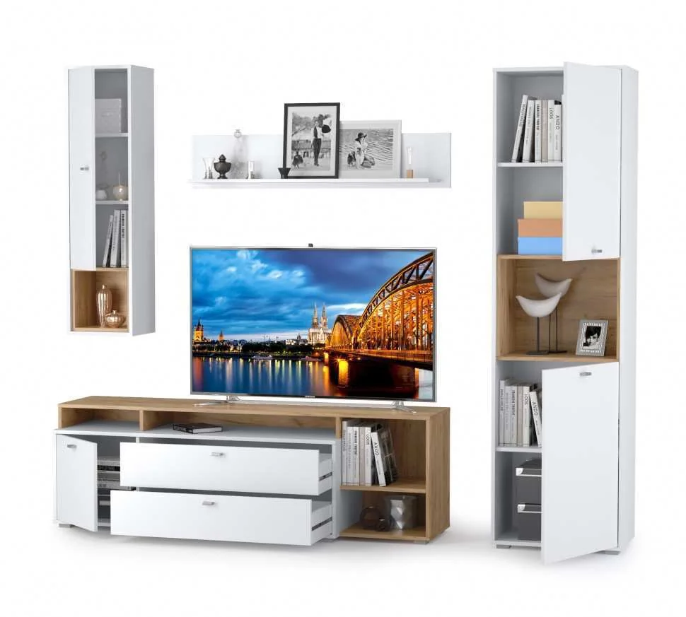 Оригинальная стенка для гостиной выполненная в белом цвете в сочетании теплого цвета древесины Дуб Золотой. Выдержана в традициях минимализма, прекрасно подойдет не только для помещения выполненного в идентичном стиле, но в любом другом современном стиле. Не смотря на то что набор имеет воздушную компоновку, он совмещает в себе не только красоту, но и удобность и практичность. В шкафах и на полке Вы сможете положить вещи, поставить книги. Тумба подойдет не только размещения телевизора с широкой диагональю, но и как система хранения.