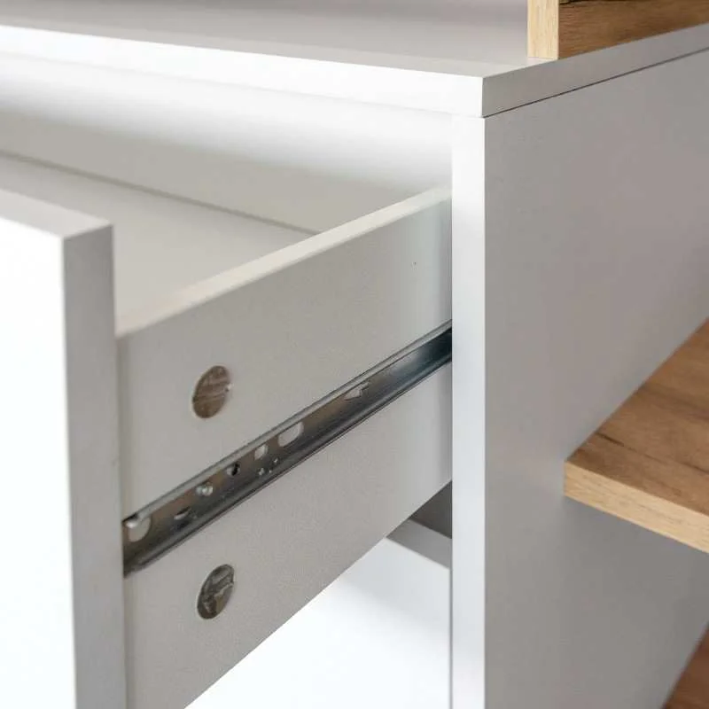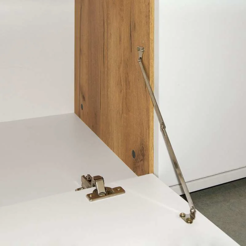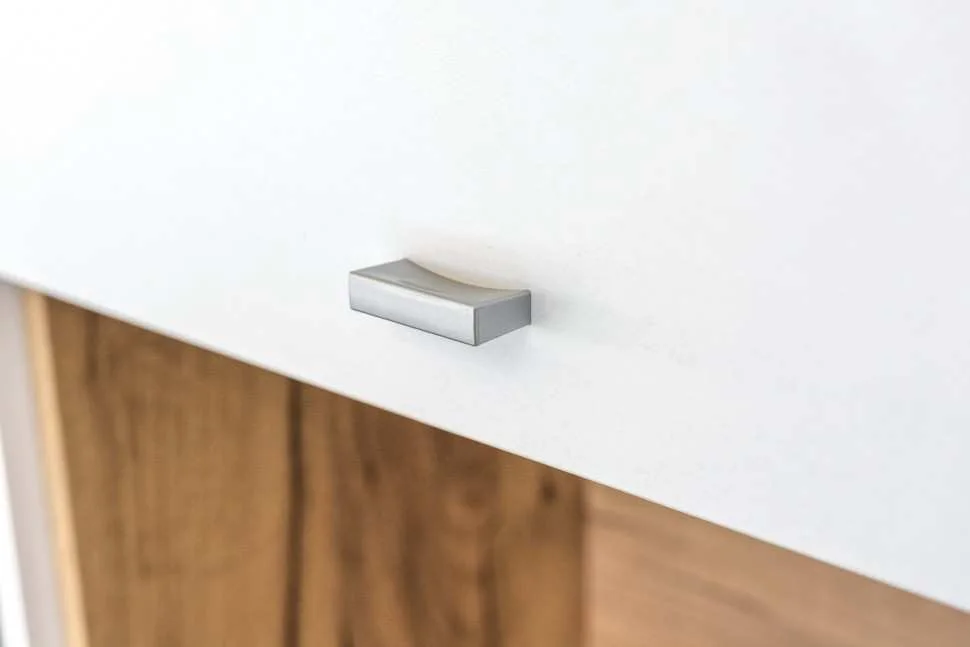 Модель изготовлена из ЛДСП 16 мм, кромка ПВХ. Распашные двери установлены на четырехшарнирные петли, выдвижные ящики — фолдинги на шариковых направляющих. Ручки — ABS-пластик в цвете сатин.