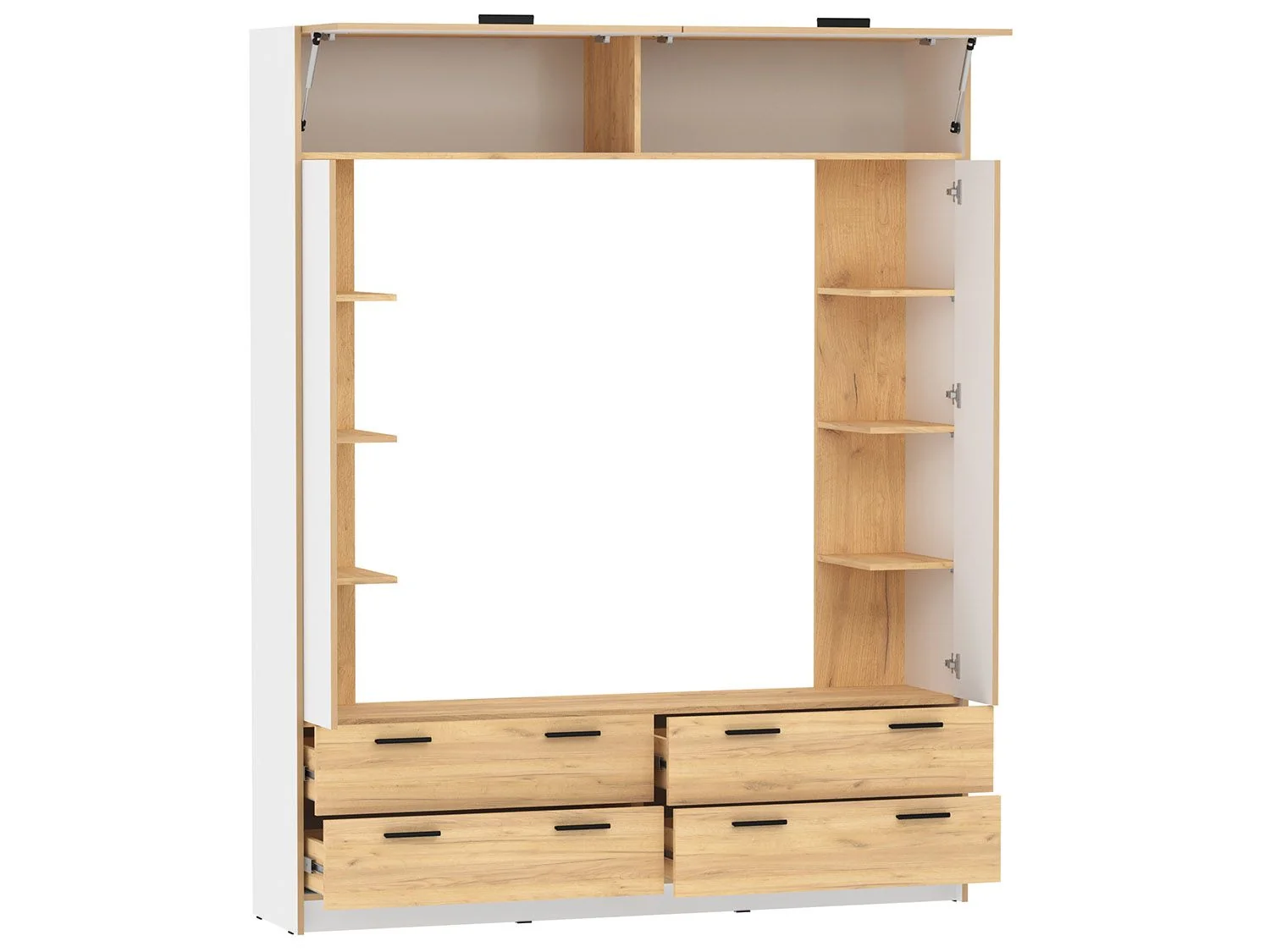 Присутствуют полки и выдвижные ящики для хранения.