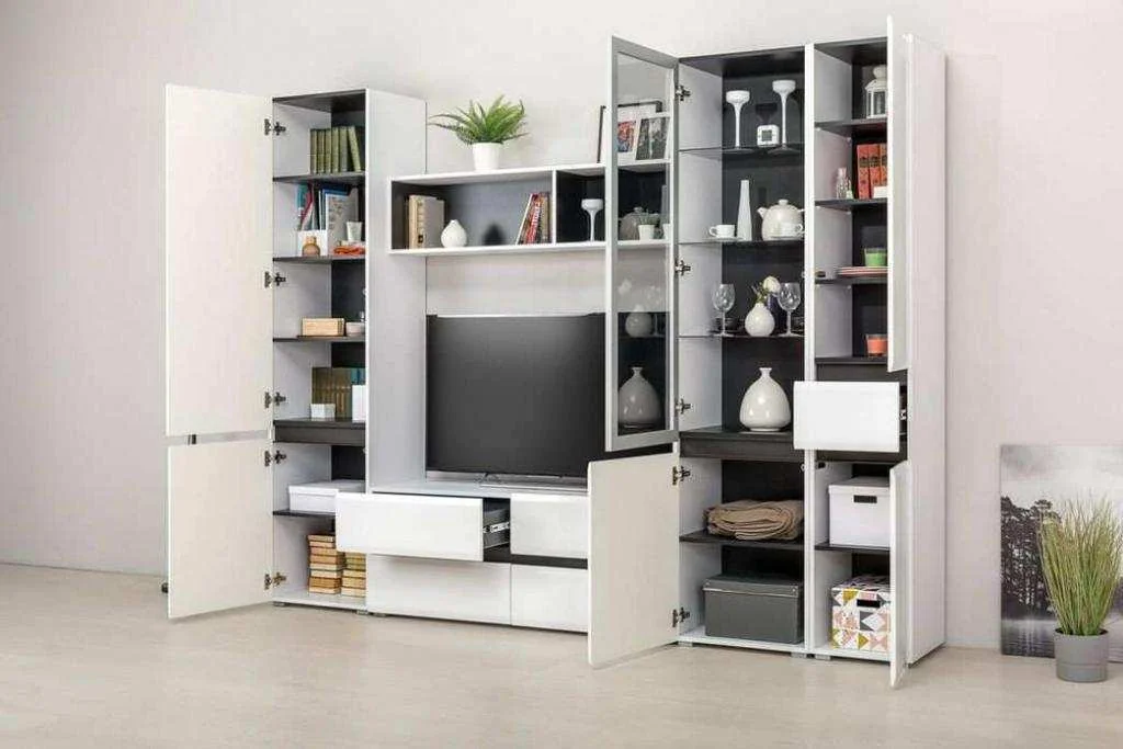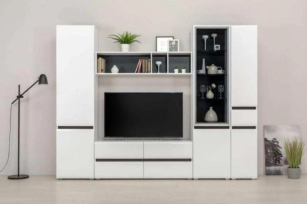 Стенка Сидней-отличный современный вариант. Белые фасады с черными вставками между ними-необычное дизайнерское решение. Стекло витрины-серое, тонированное.