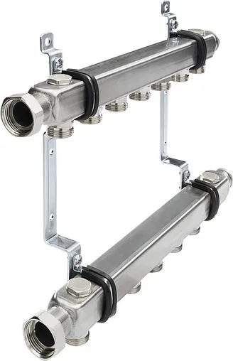 Коллектор для систем отопления из нержавеющей стали изготовлен из прямоугольной конструкционной трубы из нержавеющей стали размером 40 x 1,5 мм (класс 1.4301) в соответствии с DIN EN 10088 с накидной гайкой G 1″ и плоским уплотнением, никелированная латунь, расстояние между выводами контуров 50 мм.