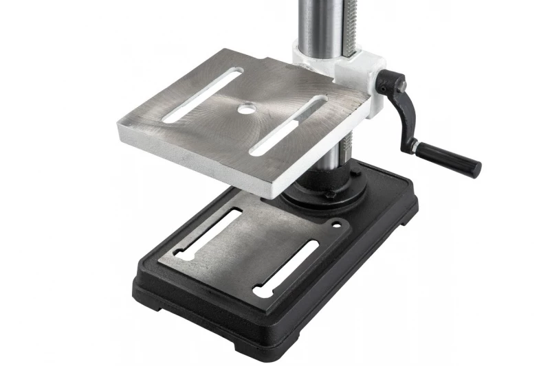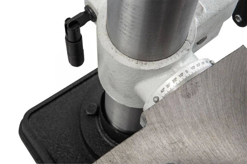 Рукоятка привода пиноли оборудована лимбом для контроля подачи и имеет встроенный ограничитель хода (глубины сверления). В штатный комплект поставки входят быстрозажимной патрон и станочные тиски Wilton, для крепления которых предусмотрены пазы на столе и на опорном основании станка.