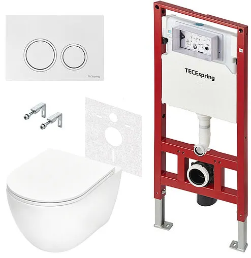 Комплект для установки подвесного унитаза: застенный модуль, панель смыва TECEspring R белая глянцевая с хромированным контуром клавиш, унитаз TECEspring R