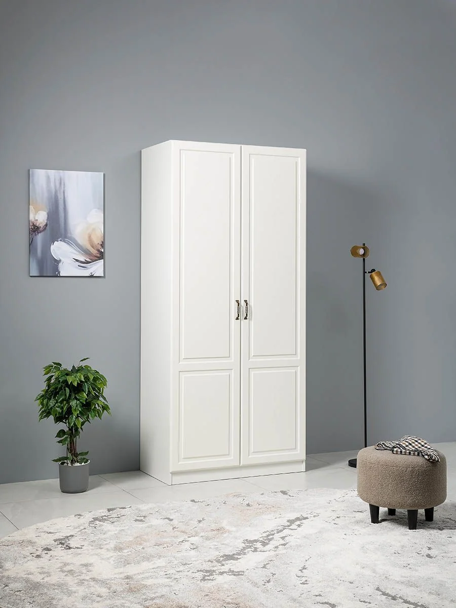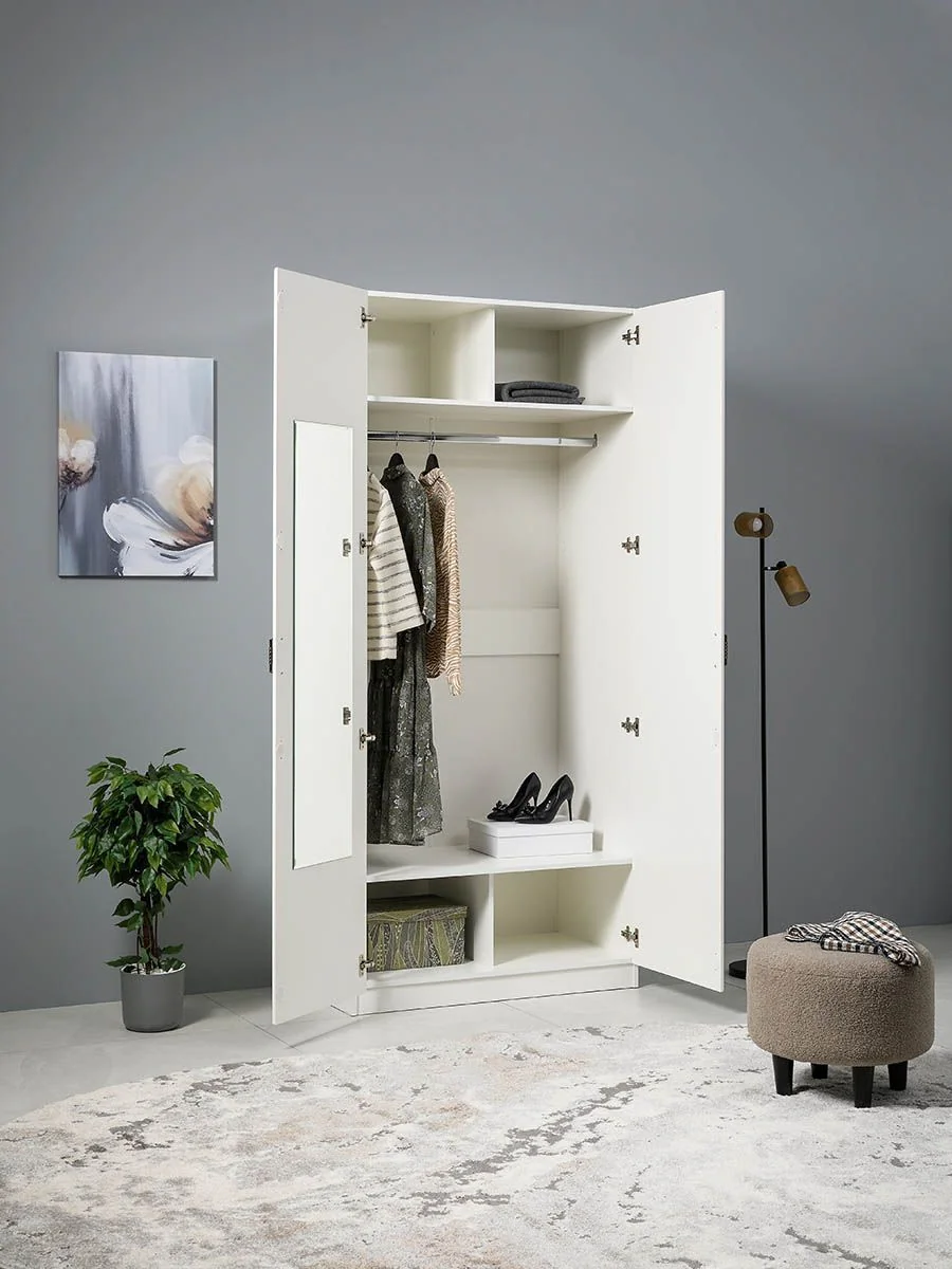 Внутри 2е полки с 2я секциями для хранения и горизонтальная штанга для плечиков с одеждой.