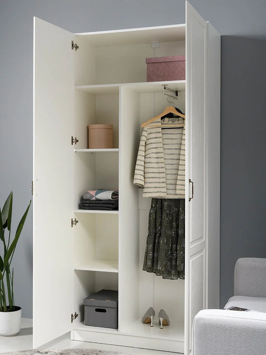 Внутреннее наполнение модели представлено широкой нишей со штангой для вешалок, глубокой антресолью и вертикальным блоком с тремя полками.