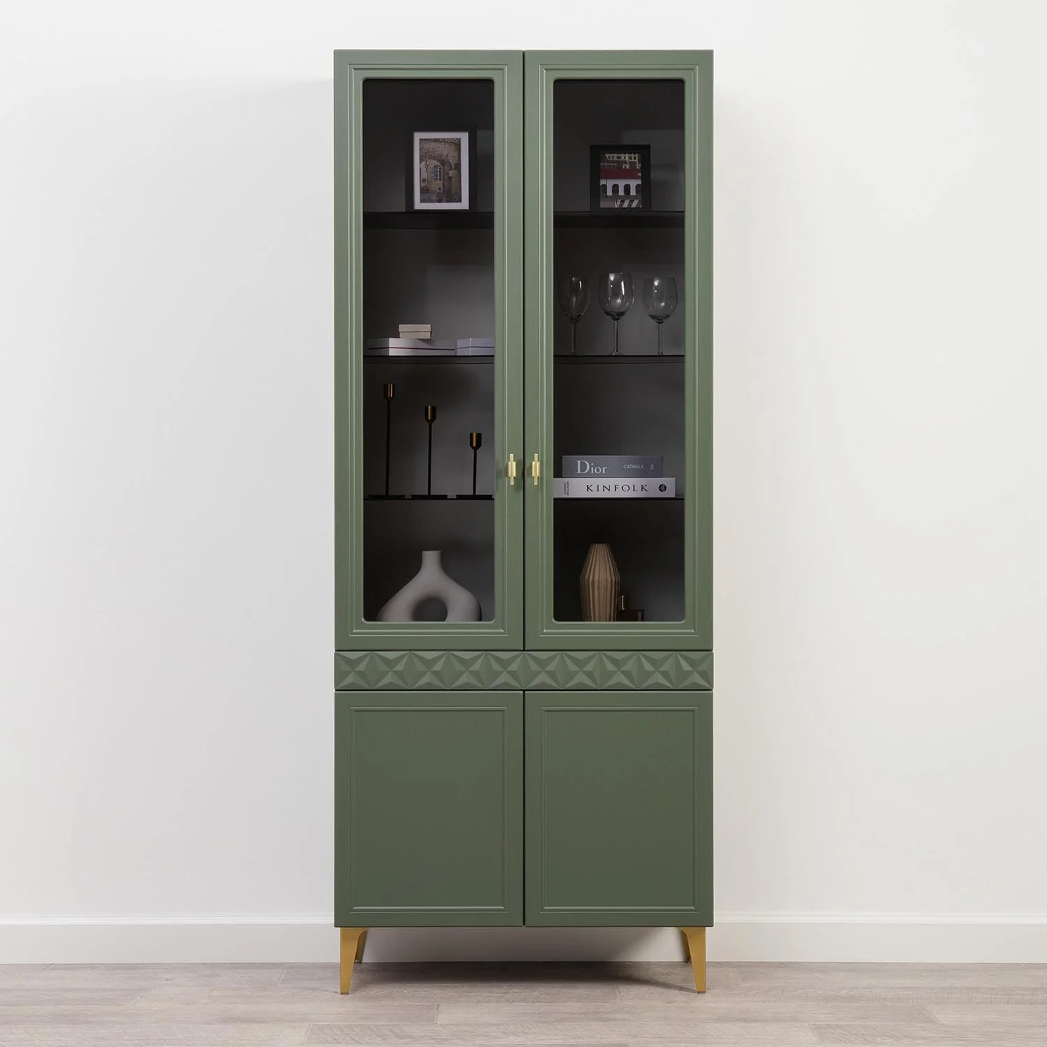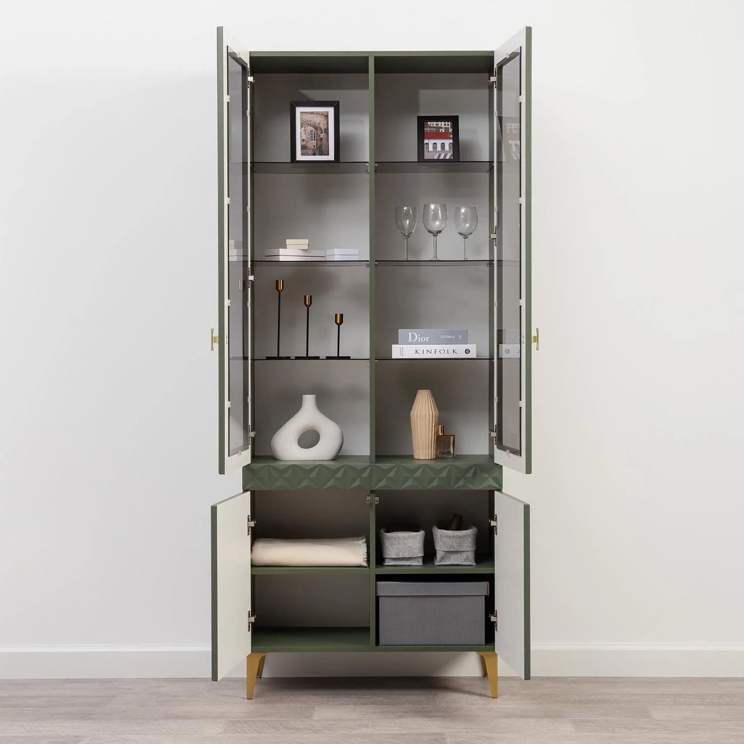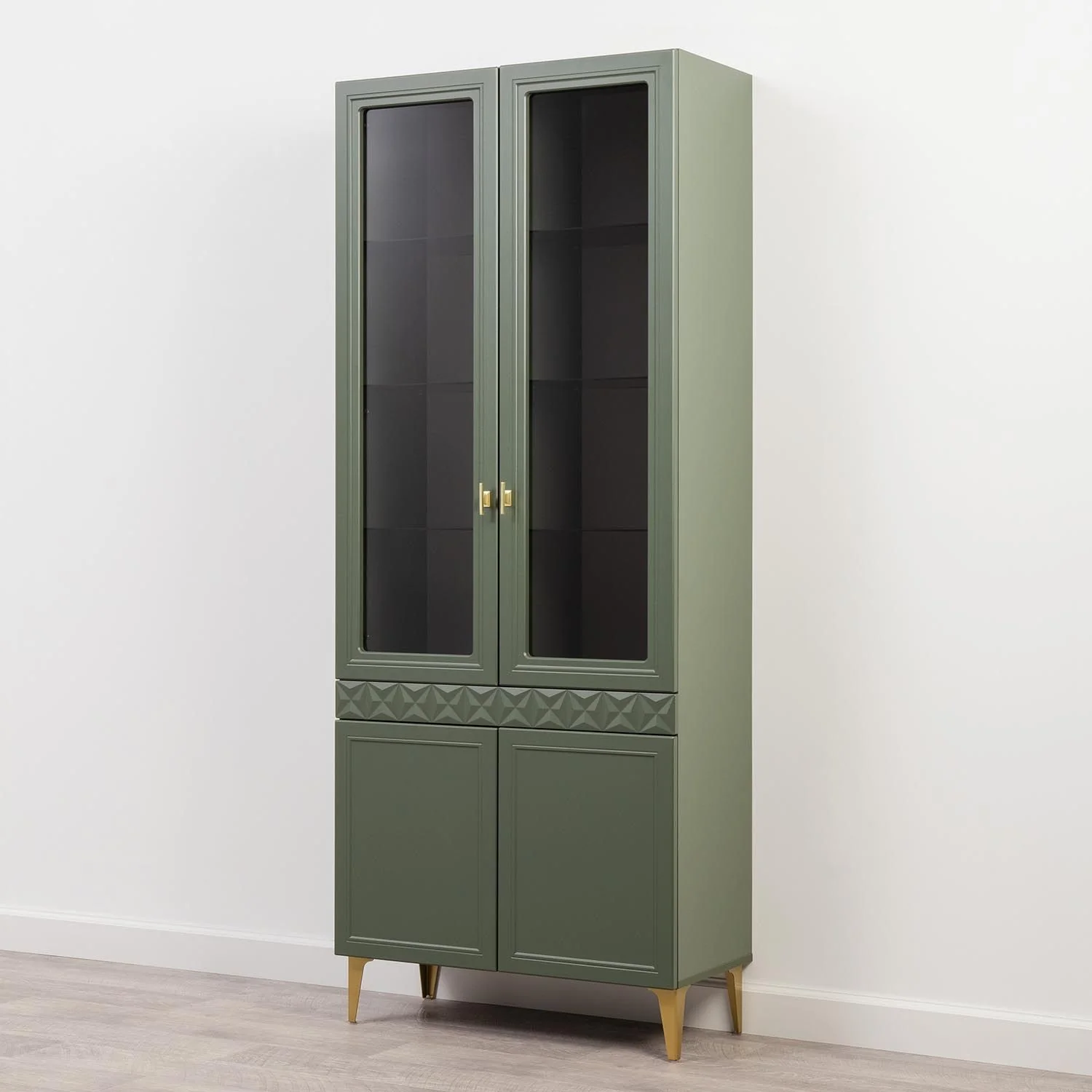Марион шкаф-витрина 16.397.02 Дымчатый зеленый / Олива шагрень создаст яркое место для хранения вещей.