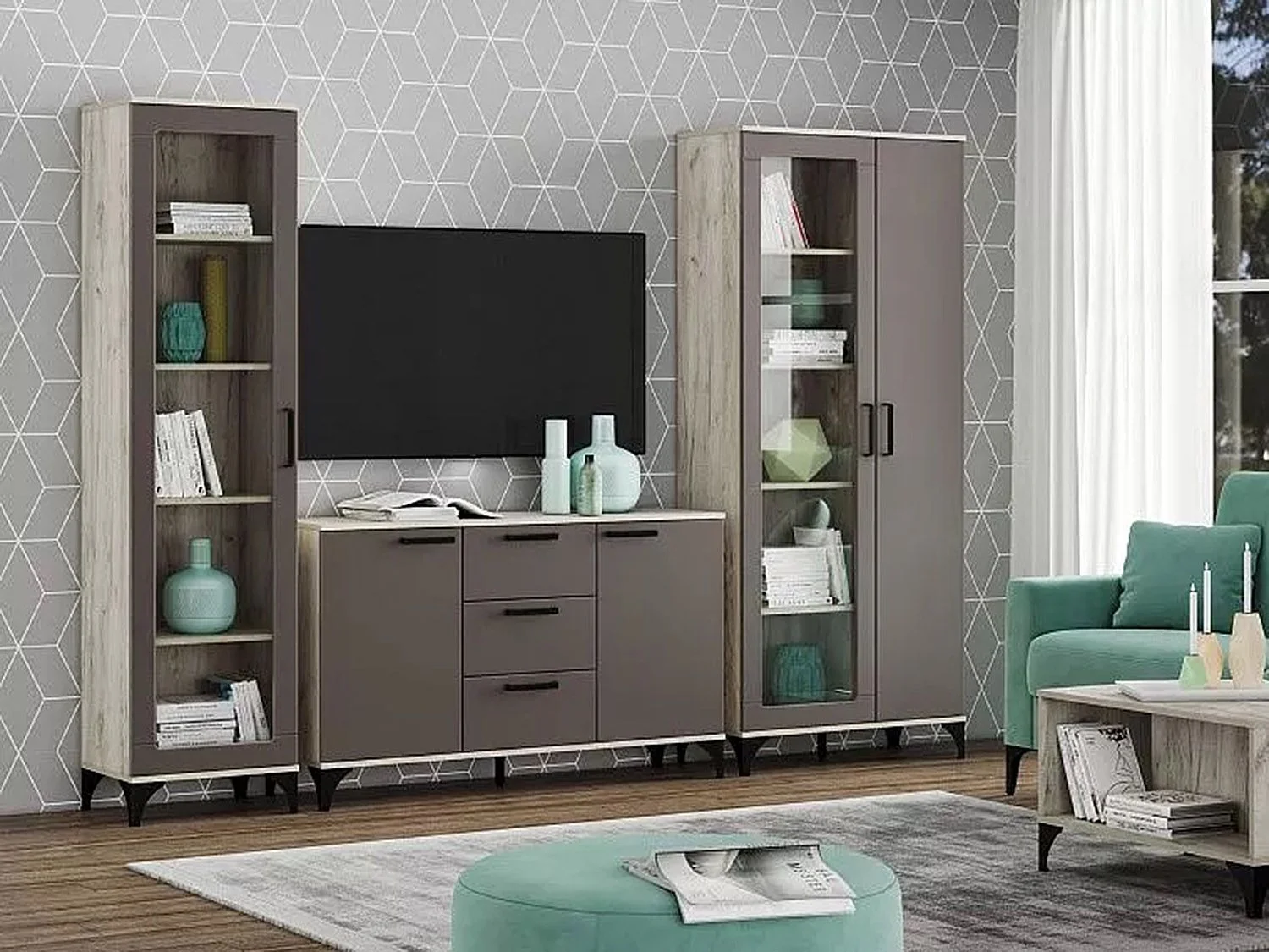 Марсель гостиная комплектация 2 Дуб Крафт серый/Софт графит — яркий и современный гарнитур для гостиной комнаты.