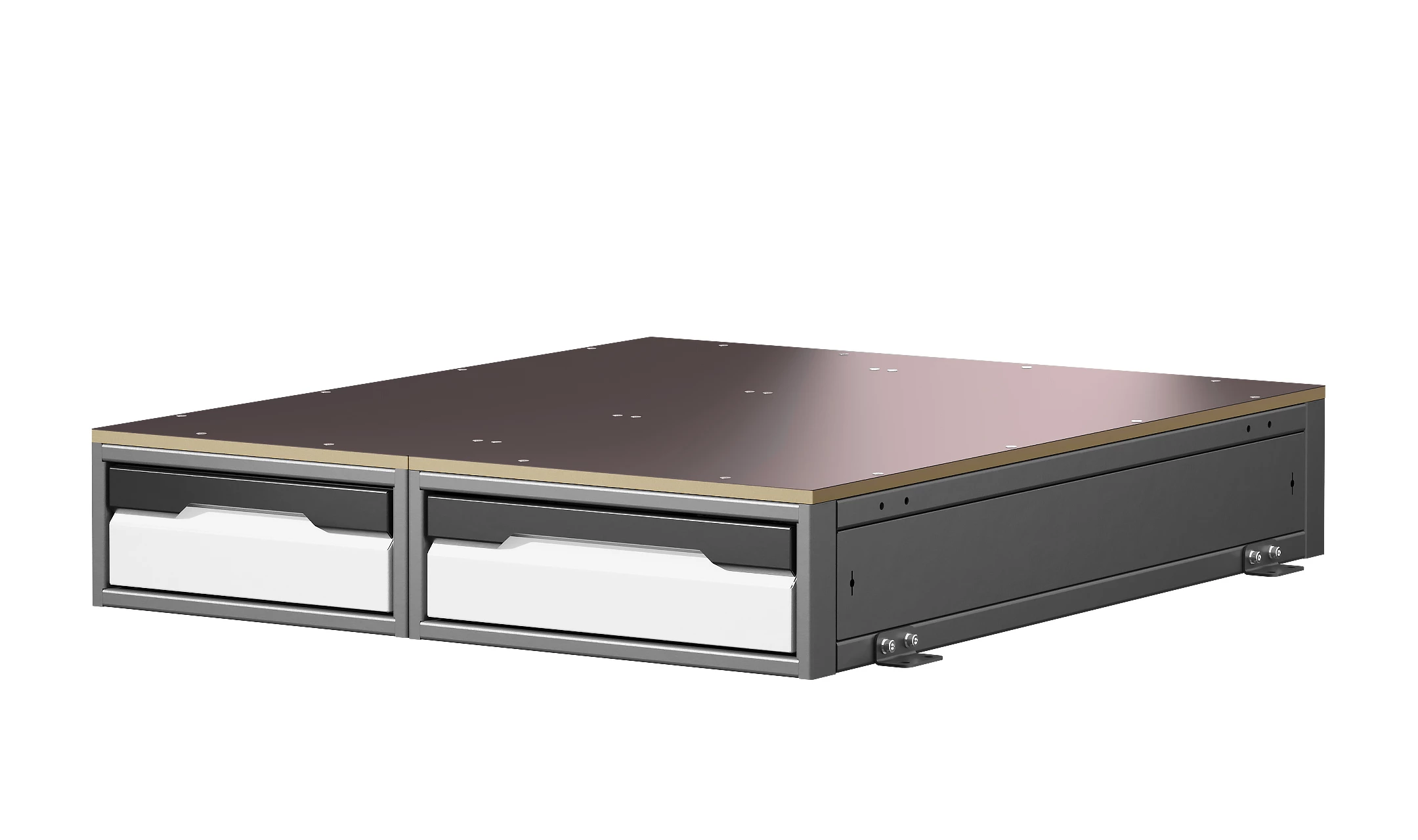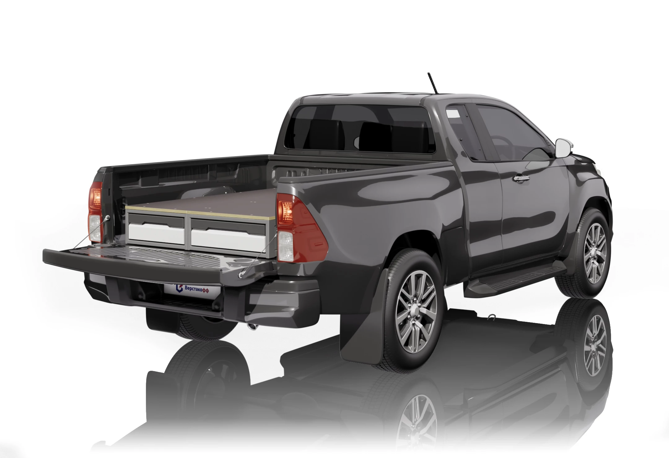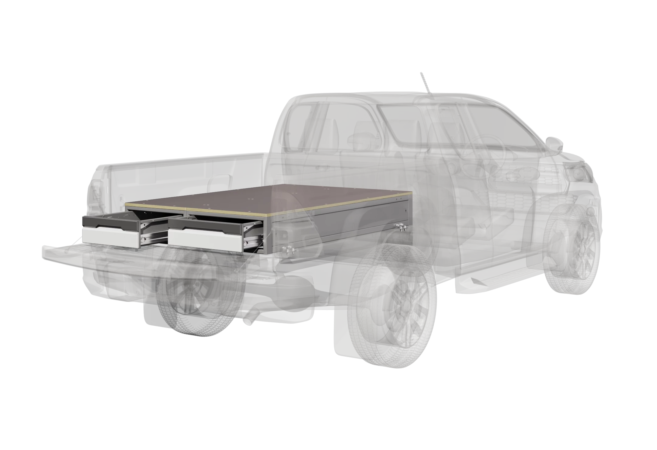 Надежное крепление модуля к кузову пикапа обеспечивает стабильность во время движения, предотвращая вибрации и смещения даже на пересеченной местности. Наличие сварных рамок обеспечивает надежность конструкции, формируемой в единый сверхпрочный каркас. Выдвижные ящики обеспечивают хранение инструментов и оборудования общей массой до 200 кг предоставляют удобный доступ к содержимому благодаря направляющим полного выдвижения. Ящики оснащены клавишной системой фиксации, интегрированной в эргономичную ручку. Система препятствует самопроизвольному открыванию ящиков, что обеспечивает защиту и сохранность содержимого в движении и идеально подходит для передвижных мастерских. При необходимости внутреннее пространство ящиков может разделяться на отсеки с помощью системы делителей.