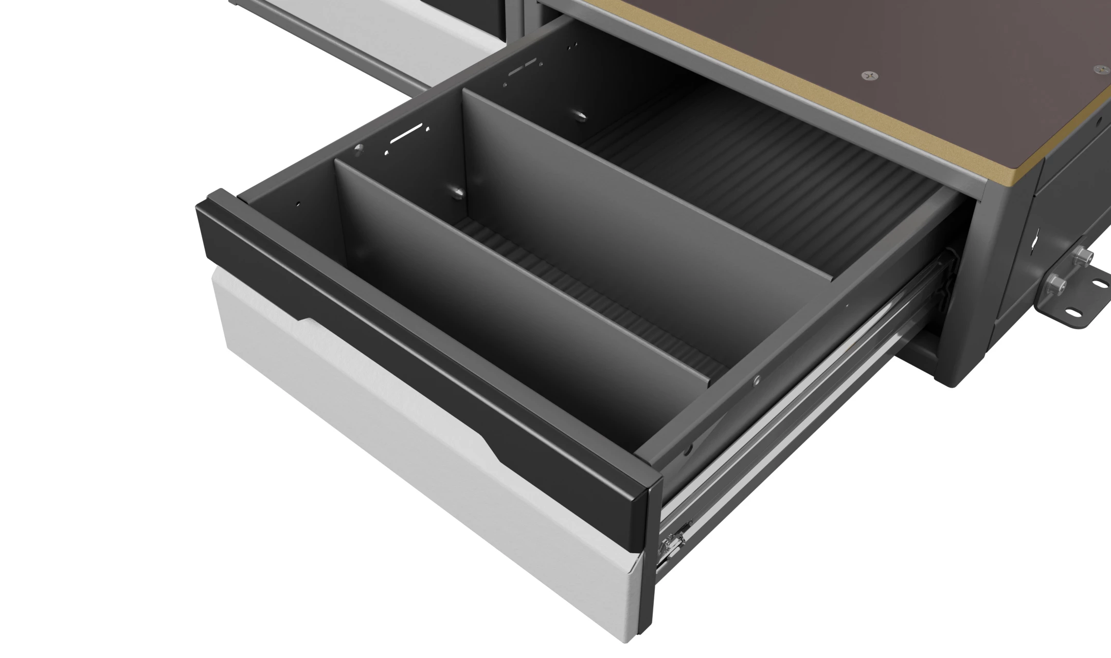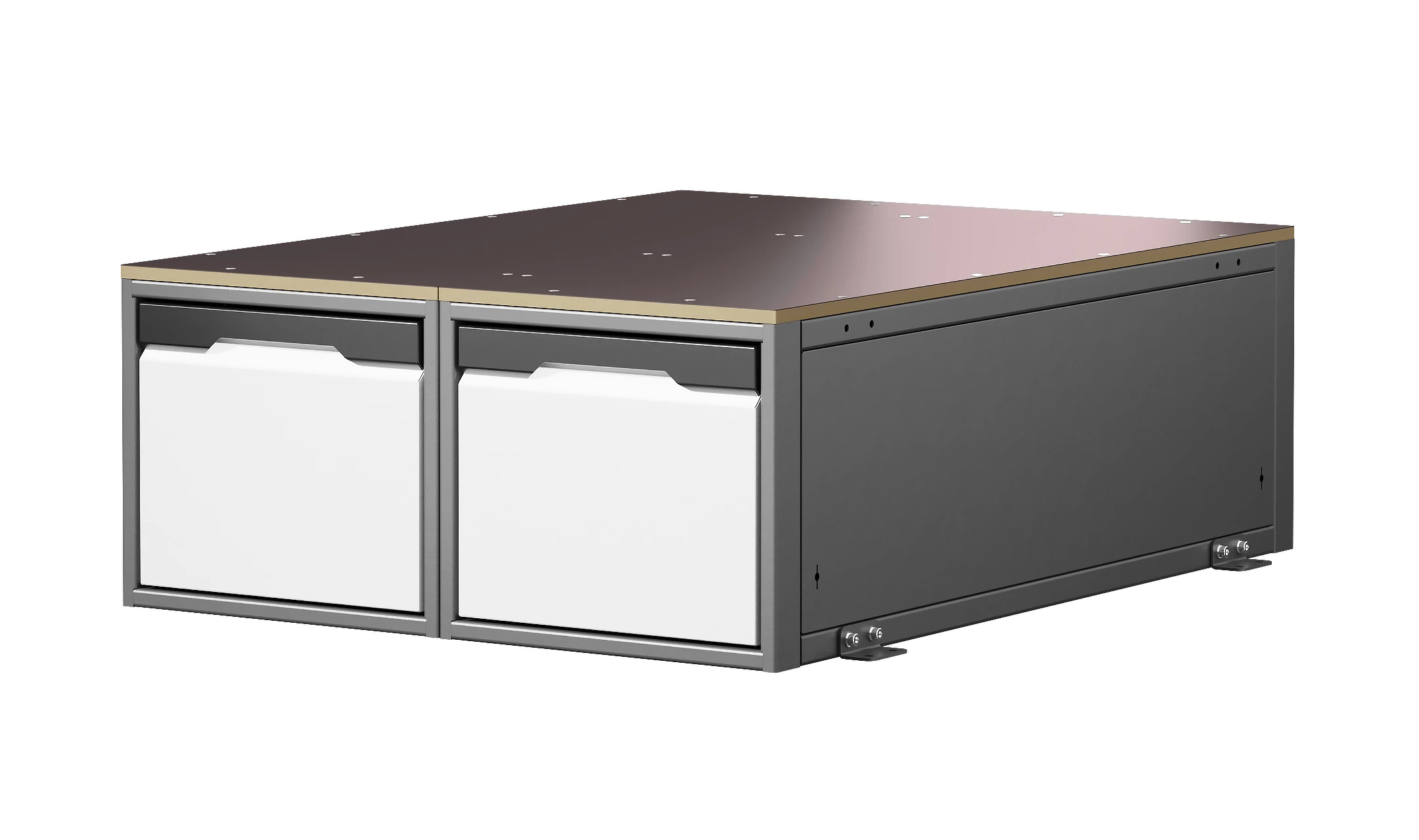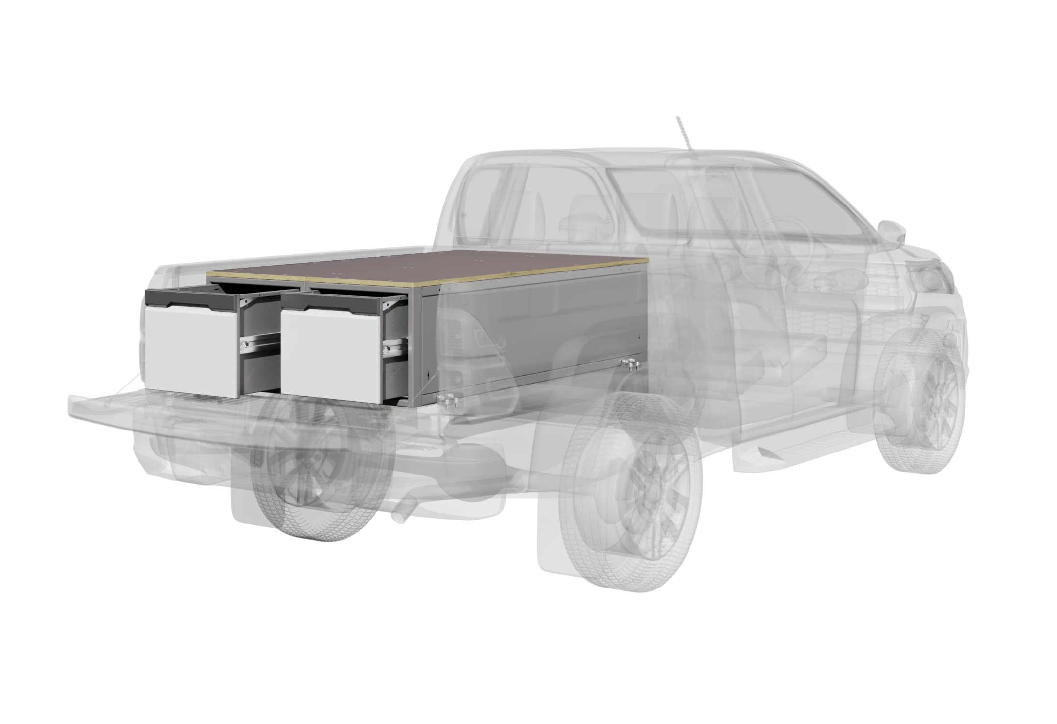 Надежное крепление модуля к кузову пикапа обеспечивает стабильность во время движения, предотвращая вибрации и смещения даже на пересеченной местности. Наличие сварных рамок обеспечивает надежность конструкции, формируемой в единый сверхпрочный каркас. Выдвижные ящики обеспечивают хранение инструментов и оборудования общей массой до 200 кг предоставляют удобный доступ к содержимому благодаря направляющим полного выдвижения. Ящики оснащены клавишной системой фиксации, интегрированной в эргономичную ручку. Система препятствует самопроизвольному открыванию ящиков, что обеспечивает защиту и сохранность содержимого в движении и идеально подходит для передвижных мастерских. При необходимости внутреннее пространство ящиков может разделяться на отсеки с помощью системы делителей.