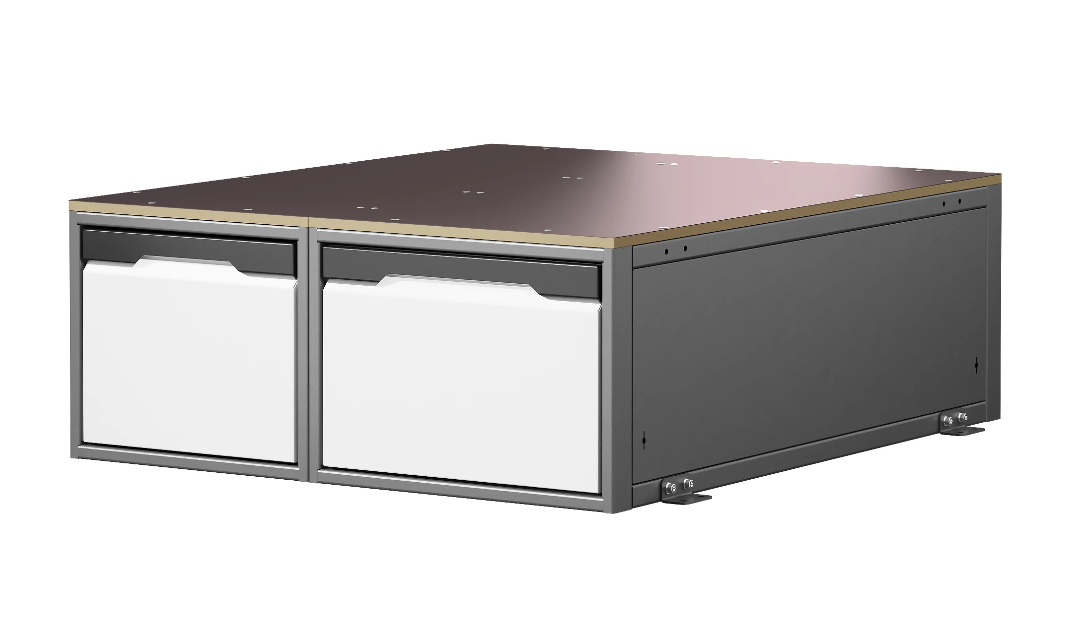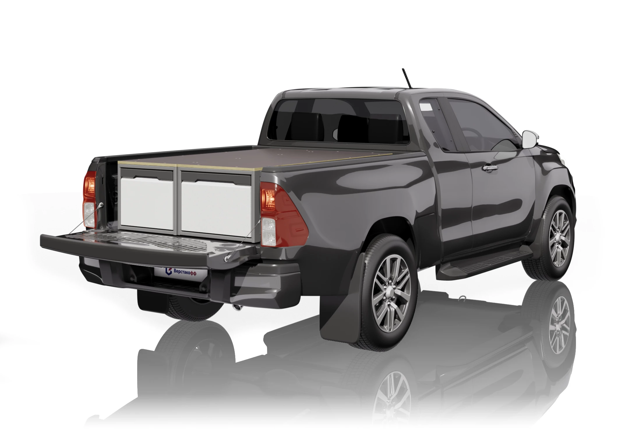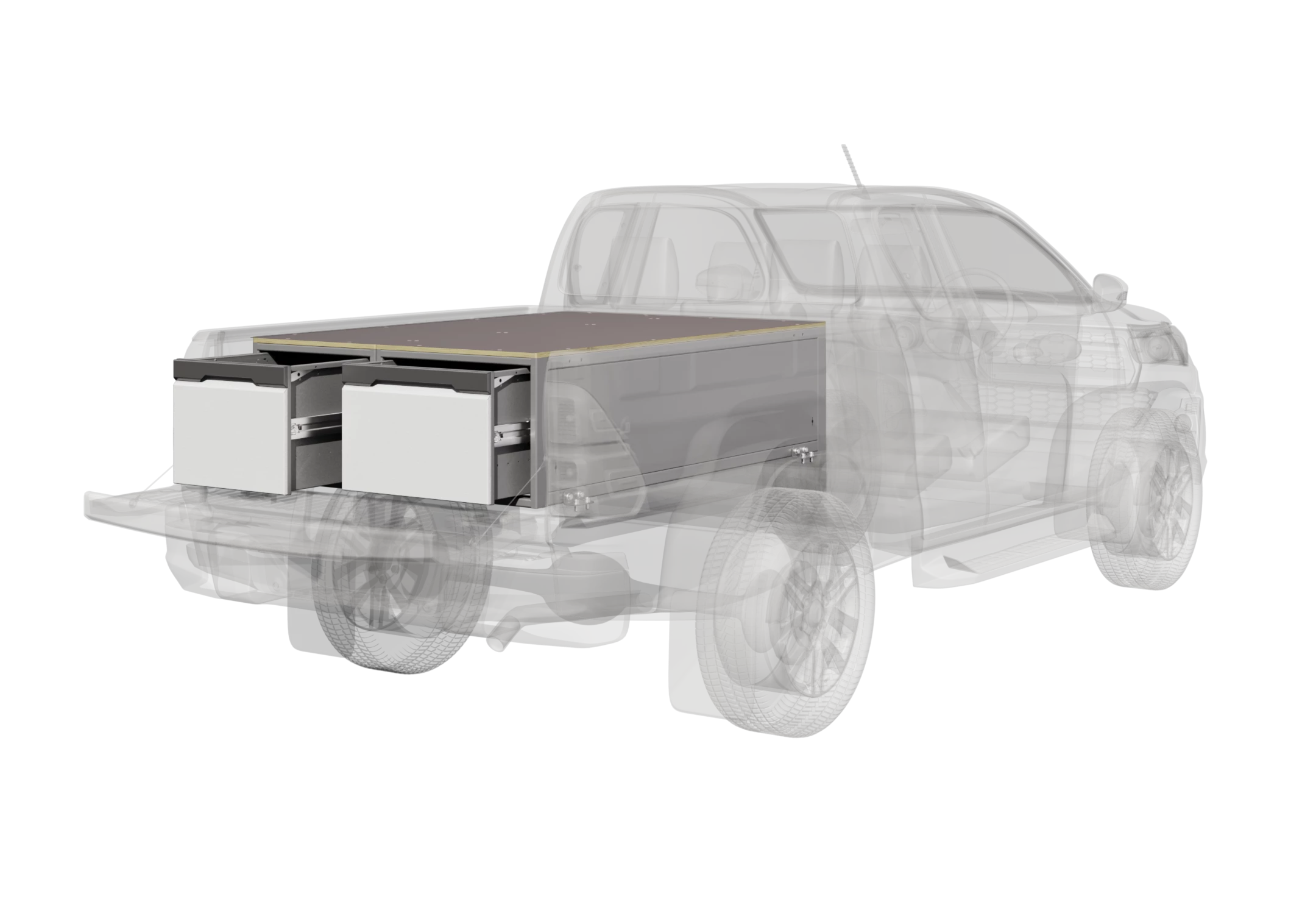 Надежное крепление модуля к кузову пикапа обеспечивает стабильность во время движения, предотвращая вибрации и смещения даже на пересеченной местности. Наличие сварных рамок обеспечивает надежность конструкции, формируемой в единый сверхпрочный каркас. Выдвижные ящики обеспечивают хранение инструментов и оборудования общей массой до 200 кг предоставляют удобный доступ к содержимому благодаря направляющим полного выдвижения. Ящики оснащены клавишной системой фиксации, интегрированной в эргономичную ручку. Система препятствует самопроизвольному открыванию ящиков, что обеспечивает защиту и сохранность содержимого в движении и идеально подходит для передвижных мастерских. При необходимости внутреннее пространство ящиков может разделяться на отсеки с помощью системы делителей.