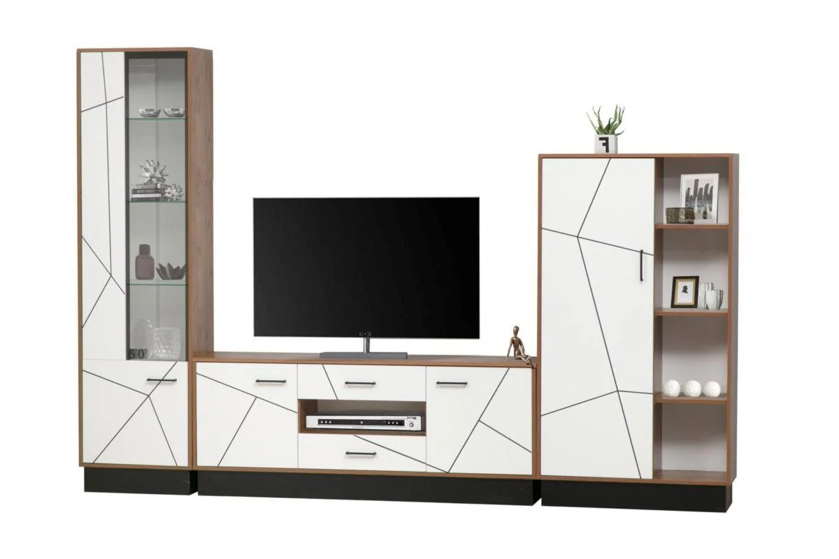 Современная модульная система для гостиной сделает комнату уютной и упорядочит все вещи. Ручки выполнены из пластика. Направляющие шариковые. Фасад комбинированный МДФ в пленке ПВХ с фрезеровкой УФ-печатью.