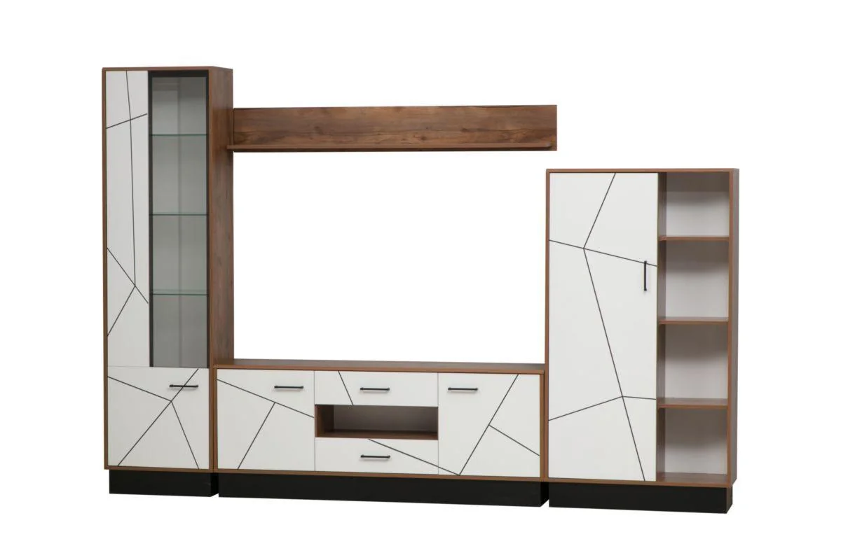Современная модульная система для гостиной сделает комнату уютной и упорядочит все вещи. Ручки выполнены из пластика. Направляющие шариковые. Фасад комбинированный МДФ в пленке ПВХ с фрезеровкой УФ-печатью.