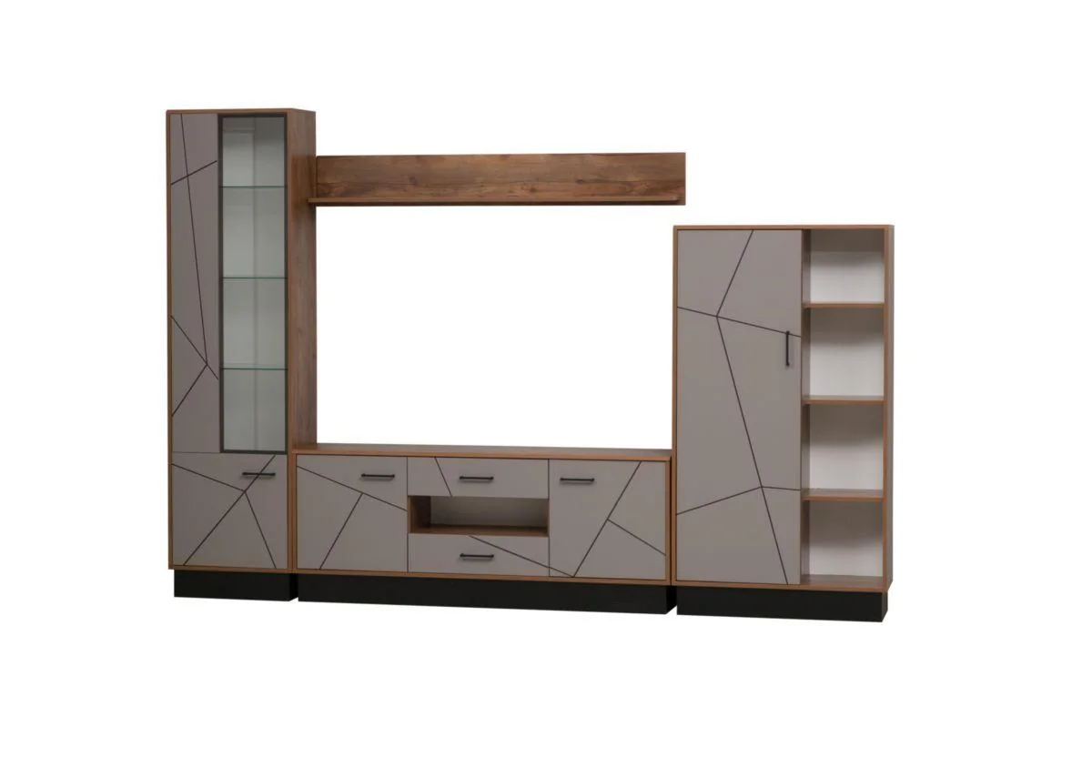 Современная модульная система для гостиной сделает комнату уютной и упорядочит все вещи. Ручки выполнены из пластика. Направляющие шариковые. Фасад комбинированный МДФ в пленке ПВХ с фрезеровкой УФ-печатью.