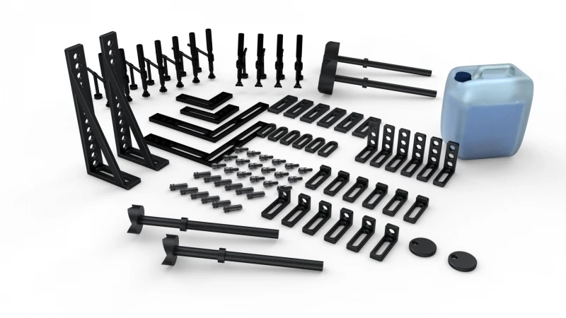Струбцина под 90 градусов 7 шт. Струбцина универсальная 4 шт. Болт позиционирующий 18 шт. Болт быстрозажимной 12 шт. Флекс упор 80 6 шт. Упор 125х50 6 шт. Вертикальный угол 90х25 6 шт. Вертикальный угол 90х90 ОС 6 шт. Вертикальный угол 90х40 6 шт. Упор эксцентриковый диаметром 75 резьбой М16 2 шт. Горизонтальный угол 275х275 2 шт. Горизонтальный угол 150х125 2 шт. Вертикальный угол 350х150 2 шт. Опора трубная 50мм резьба M16 в комплекте с удлинителем 2 шт. Опора трубная 80мм резьба M16 в комплекте с удлинителем 2 шт. Жидкость антипригарная 1 шт.