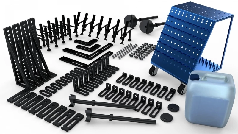 Струбцина под 90 градусов 10 шт. Струбцина универсальная 7 шт. Болт позиционирующий 24 шт. Болт быстрозажимной 20 шт. Флекс упор 80 8 шт. Упор 125х50 8 шт. Вертикальный угол 90х25 8 шт. Вертикальный угол 90х90 ОС 8 шт. Вертикальный угол 90х40 8 шт. Упор эксцентриковый диаметр 75 резьба М16 2 шт. Горизонтальный угол 275х275 2 шт. Горизонтальный угол 150х125 2 шт. Вертикальный угол 400х150 4 шт. Опора трубная 50мм резьба M16 в комплекте с удлинителем 2 шт. Опора трубная 80мм резьба M16 в комплекте с удлинителем 2 шт. Тележка для инструмента 1 шт. Жидкость антипригарная 1 шт.