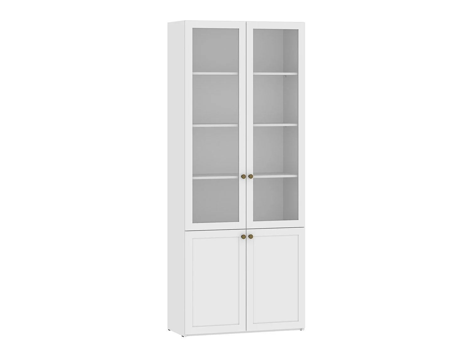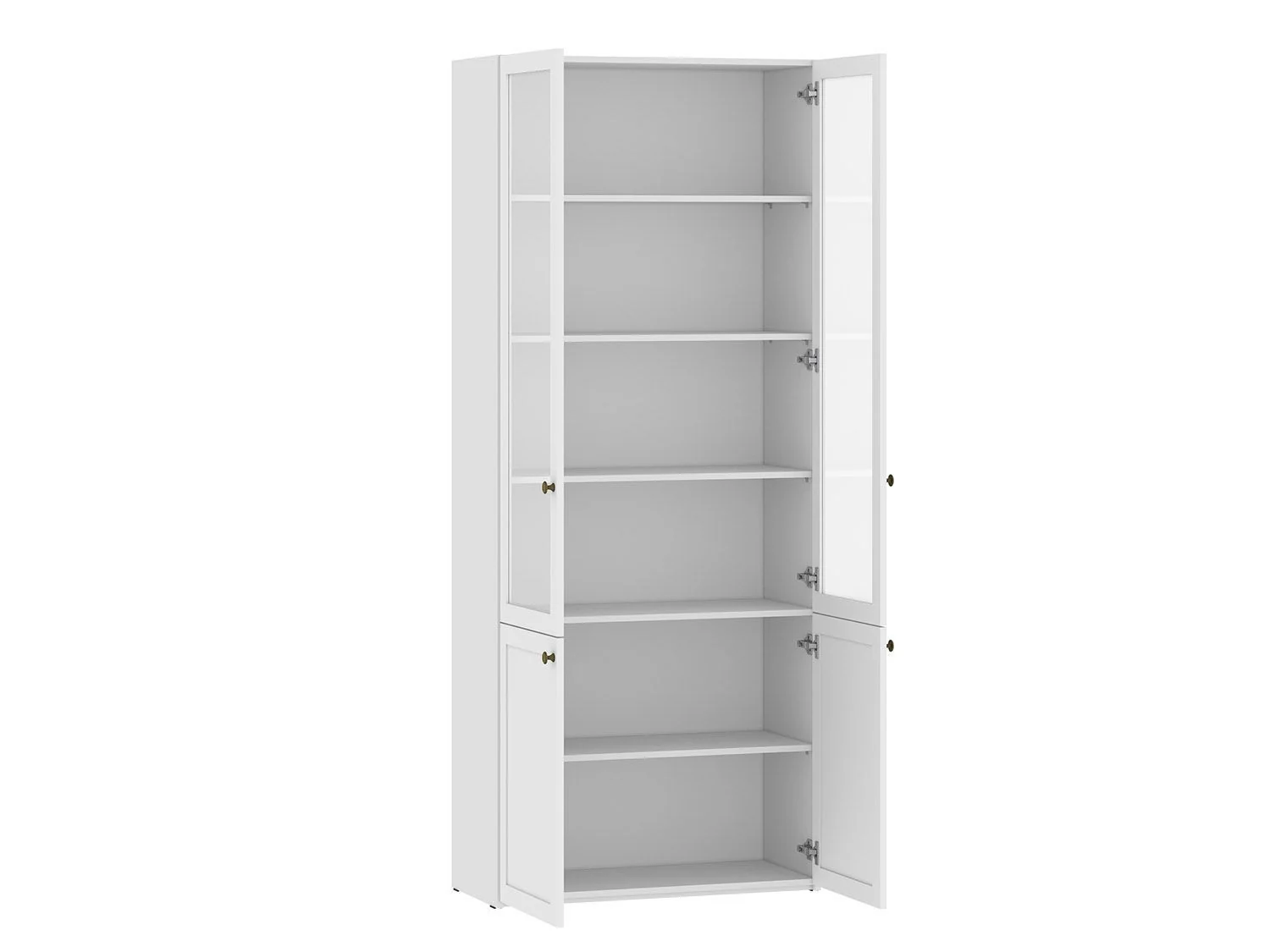 Шкаф оснащен шестью полками для хранения и 4-я распашными дверцами, две со стеклянными вставками и две глухие.