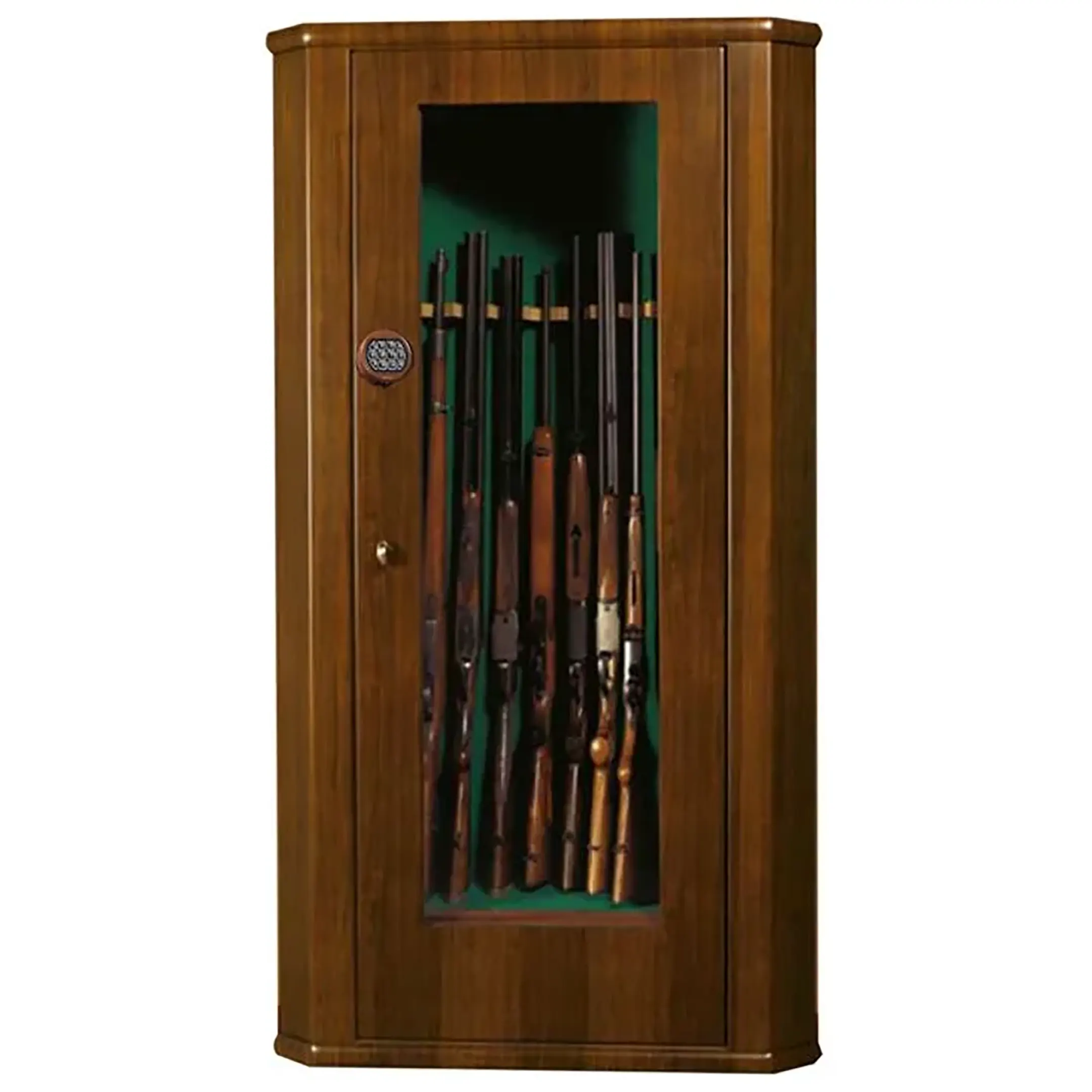 Угловой сейф открывает дополнительные возможности при создании дизайна интерьера оружейной комнаты, кабинета или гостиной. Идеальный вариант для эргономичного помещения. Бронированное стекло открывает взору содержимое сейфа, которое надежно заперто за стальной рамой электронным кодовым замком.