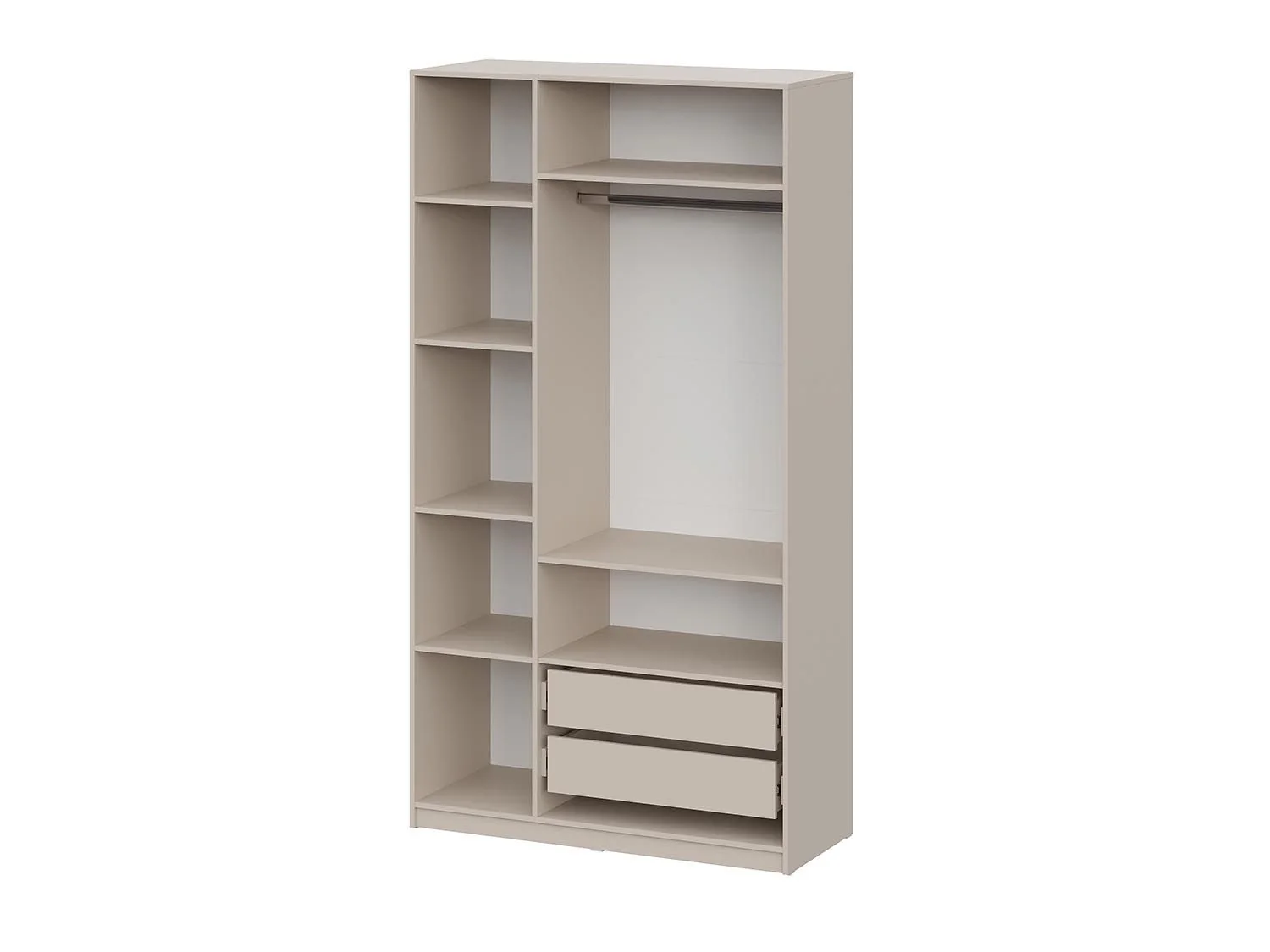 Внутри полки для хранения, штанга для плечиков с одеждой и 2-а выдвижных ящика.