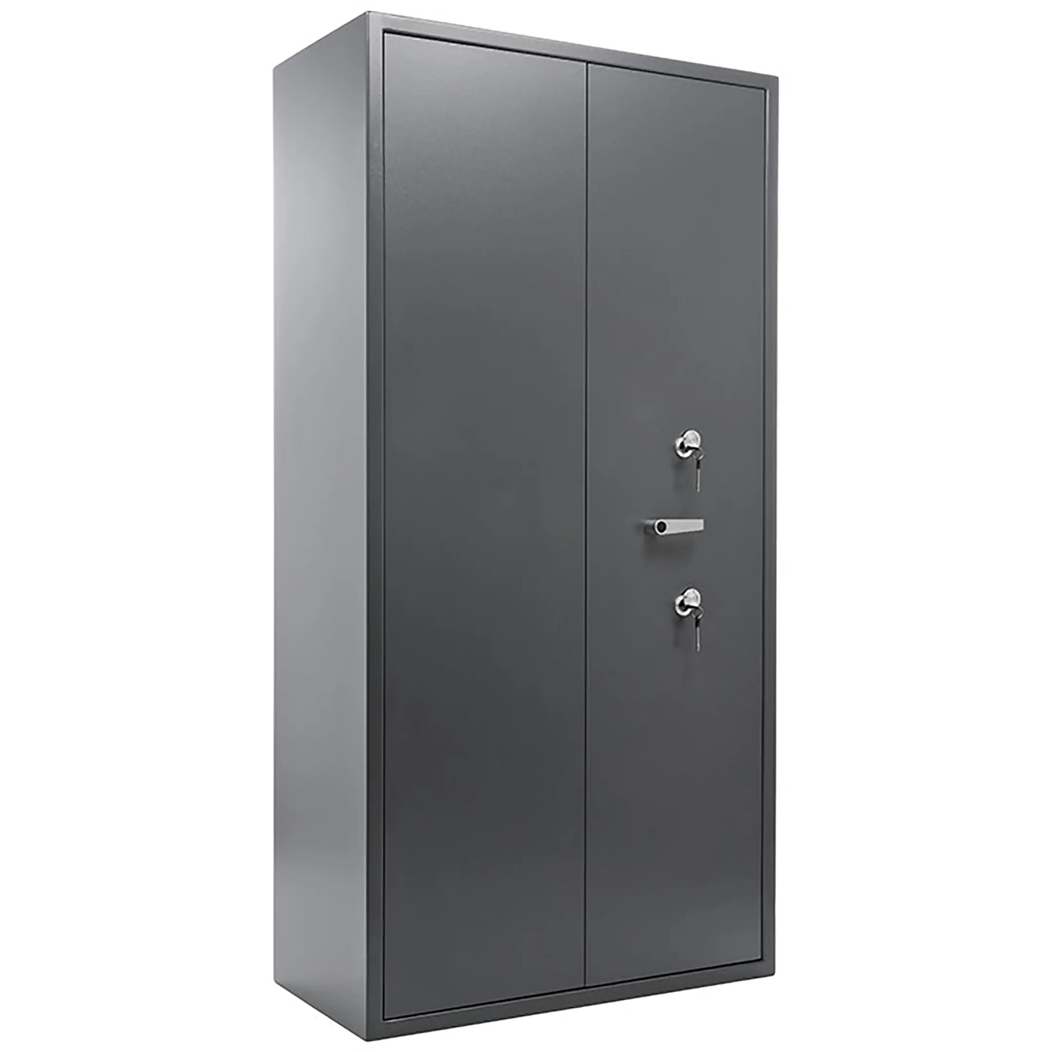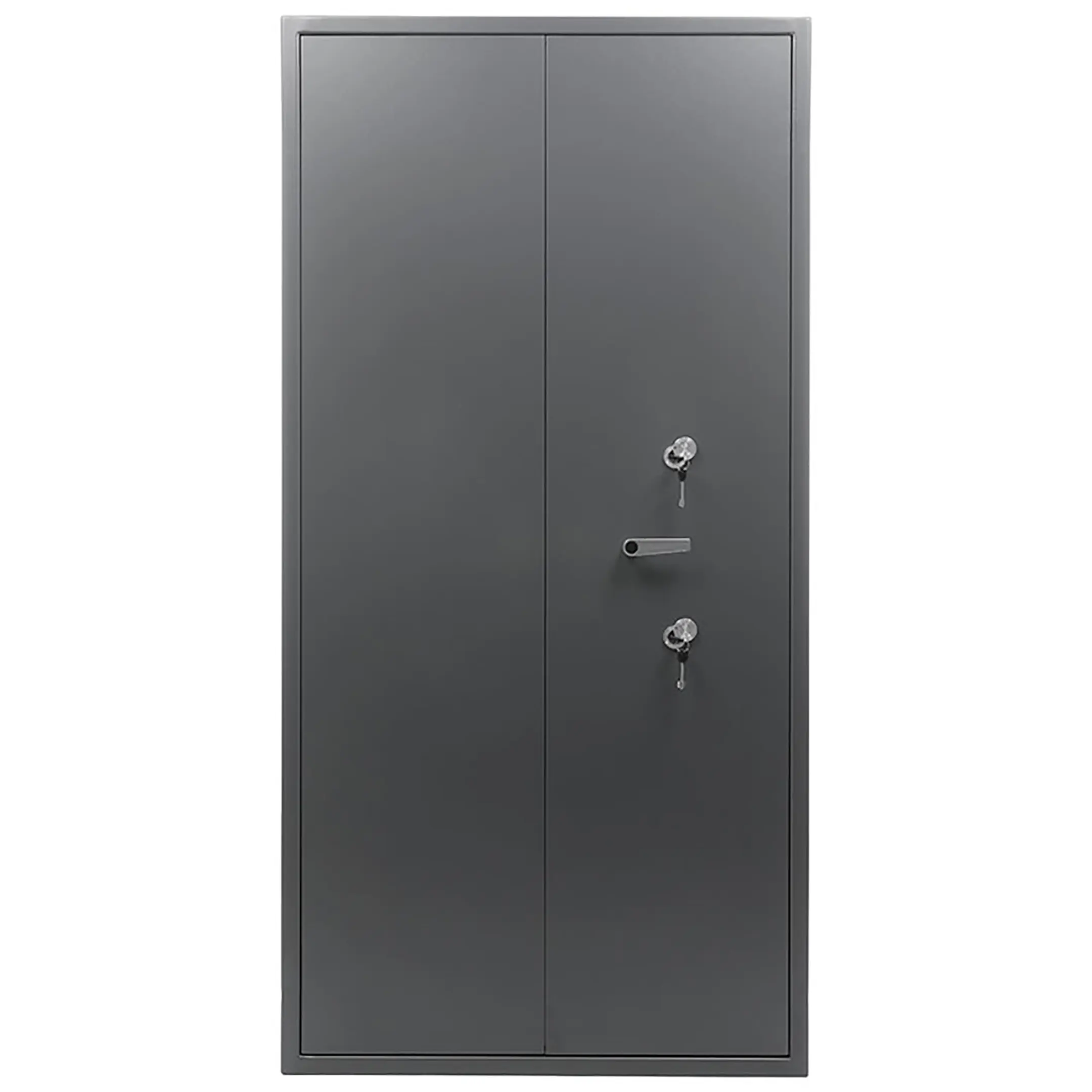 комплектуется двумя ключевыми сувальдными замками класс 2 ГОСТ 5089-2011 (по 2 ключа от каждого замка в комплекте) с опечатывающими устройствами. Поворотная ручка для удобства открывания и закрывания. Левая створка двери оборудована двумя подпружиненными самозапирающимися защелками (вверх и вниз) с приводом от ручки находящейся на внутренней стороне створки двери;