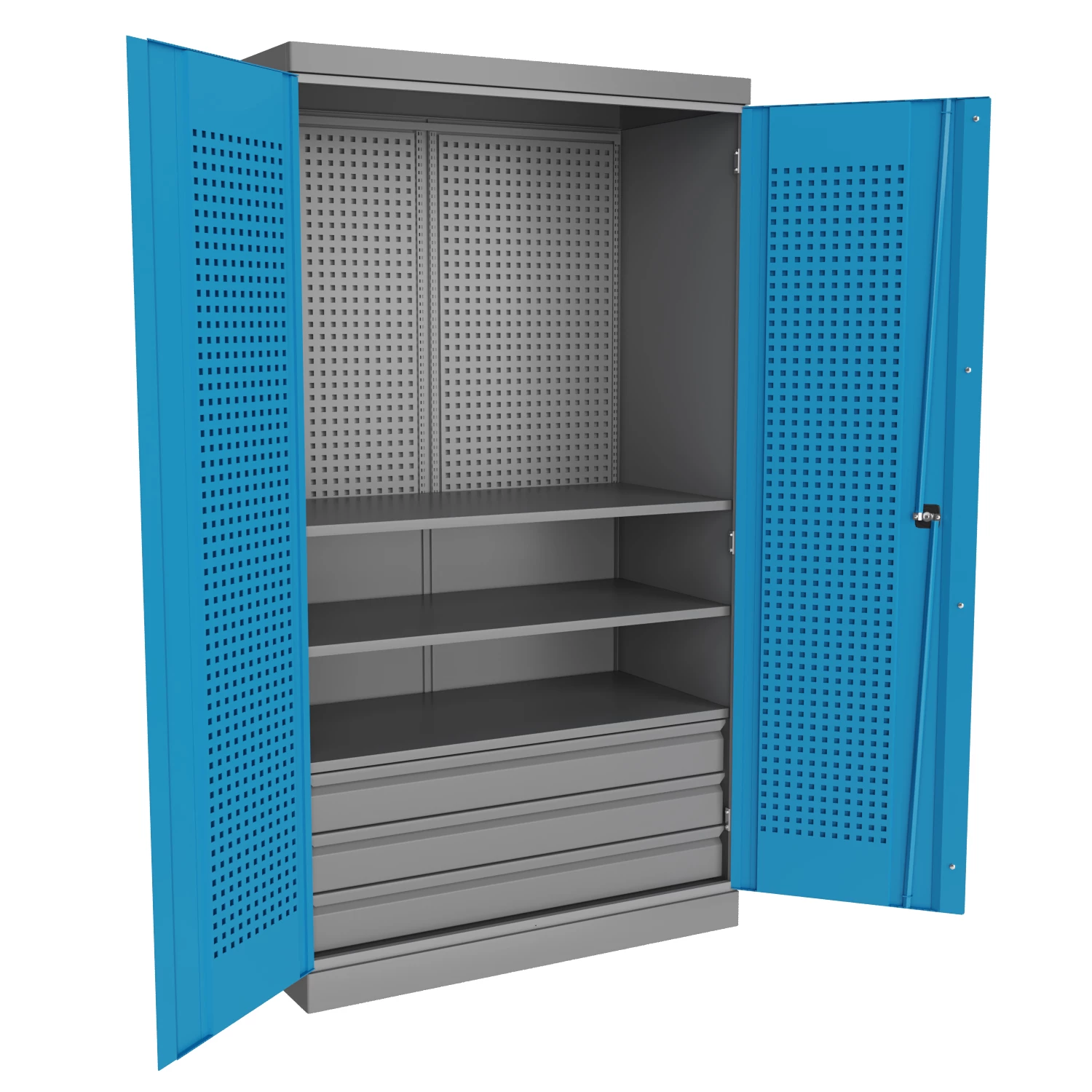 Шкаф оснащен замком «Евролок». Окраска элементов корпуса осуществляется порошковой полимерной краской: RAL 7037 (пыльно-серый), а дверцы RAL 5015 (небесно-синий) – складская программа.