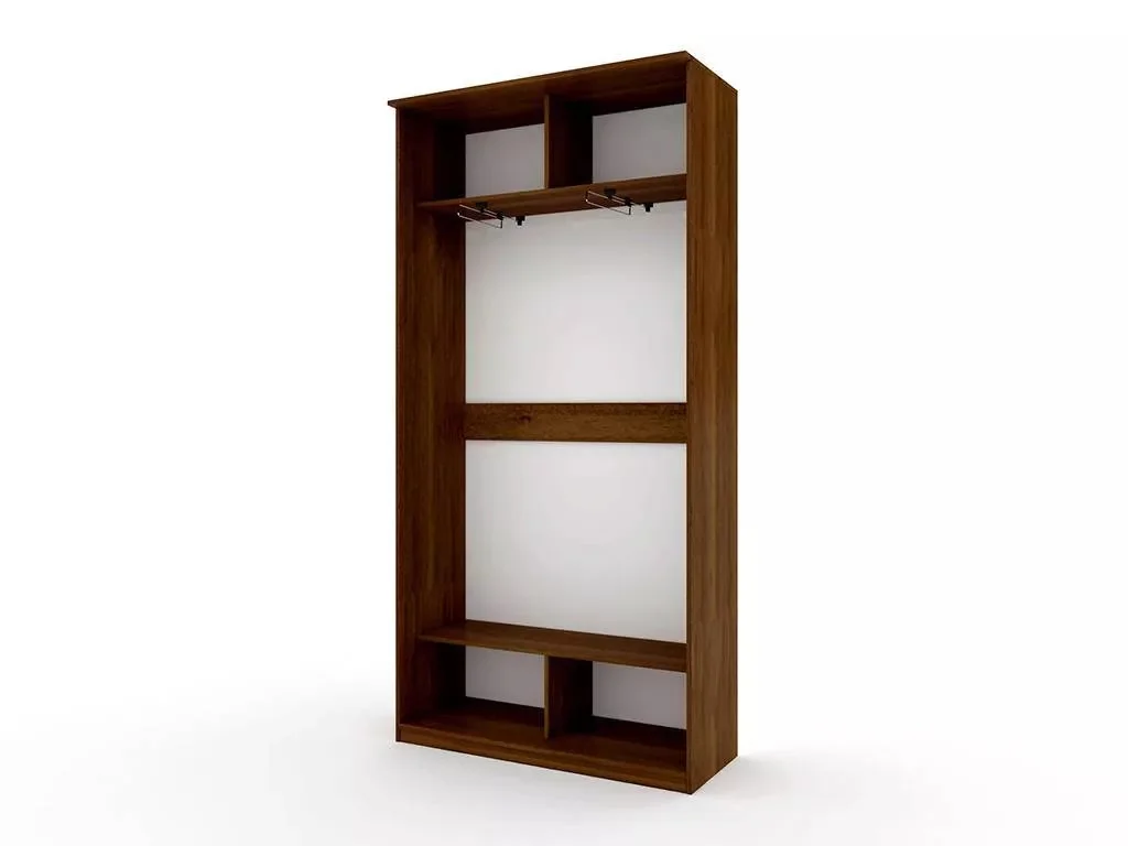 Шкаф оборудован двумя глухими дверцами, двумя полками, разделенными пополам и двумя вешалками для плечиков с одеждой.