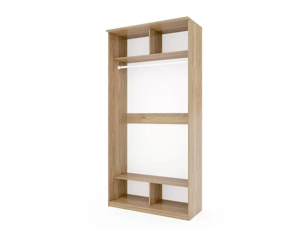 Шкаф оборудован двумя дверцами с зеркалом и украшены стильным пескоструем, двумя полками, разделенными пополам и горизонтальной перекладиной для плечиков с одеждой.