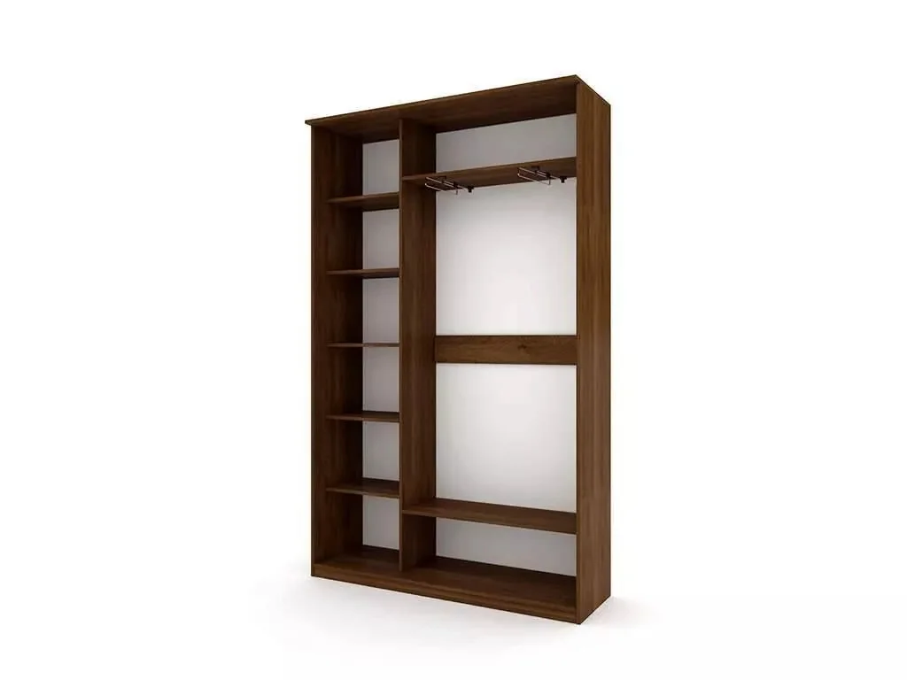 Шкаф оборудован двумя глухими дверцами, состоит из двух секций, в одной из которых 6 полок, а в другой 2 полки и две вешалки для плечиков с одеждой.