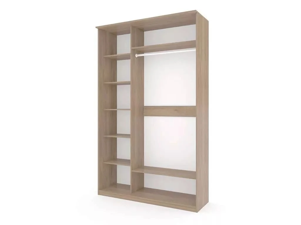 Шкаф оборудован двумя дверцами с зеркалом и украшены стильным пескоструем, состоит из двух секций, в одной из которых 6 полок, а в другой 2 полки и одна штанга для вешалок с одеждой.