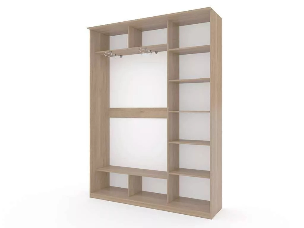 Шкаф оборудован тремя дверцами с зеркалом, состоит из двух секций, в одной из которых 6 полок, а в другой 2 полки, разделенные пополам и две вешалки для плечиков с одеждой.