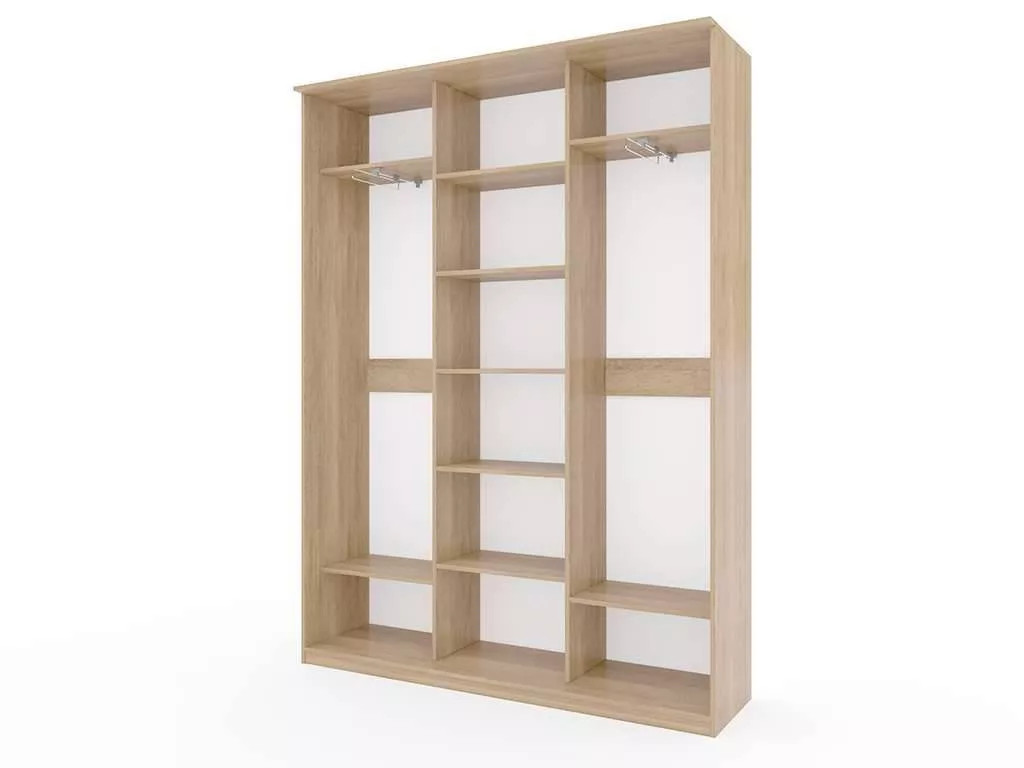 Шкаф оборудован двумя глухими дверцами и одной с зеркалом, состоит из трех равных секций, в одной из которых 6 полок, а у 2-х других по 2 полки и по 1-ой вешалке для плечиков с одеждой.