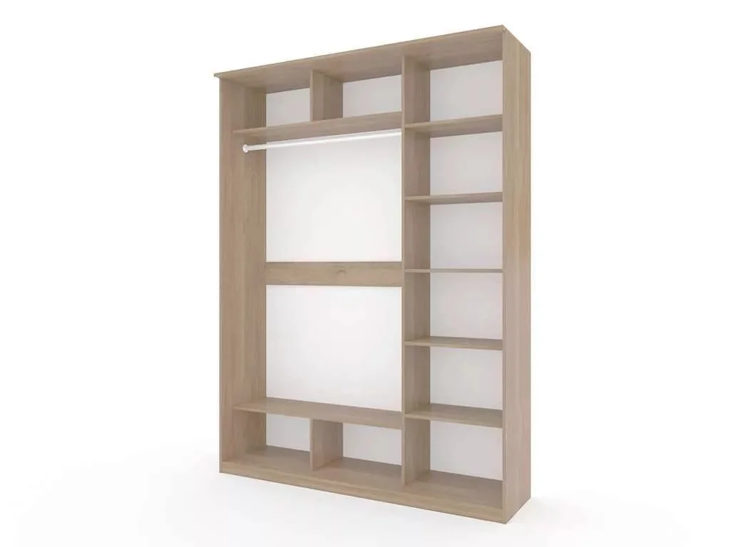 Шкаф оборудован двумя глухими дверцами и одной с зеркалом, состоит из двух секций, в одной из которых 6 полок, а в другой 2 полки, разделенные пополам и одна штанга для вешалок с одеждой.