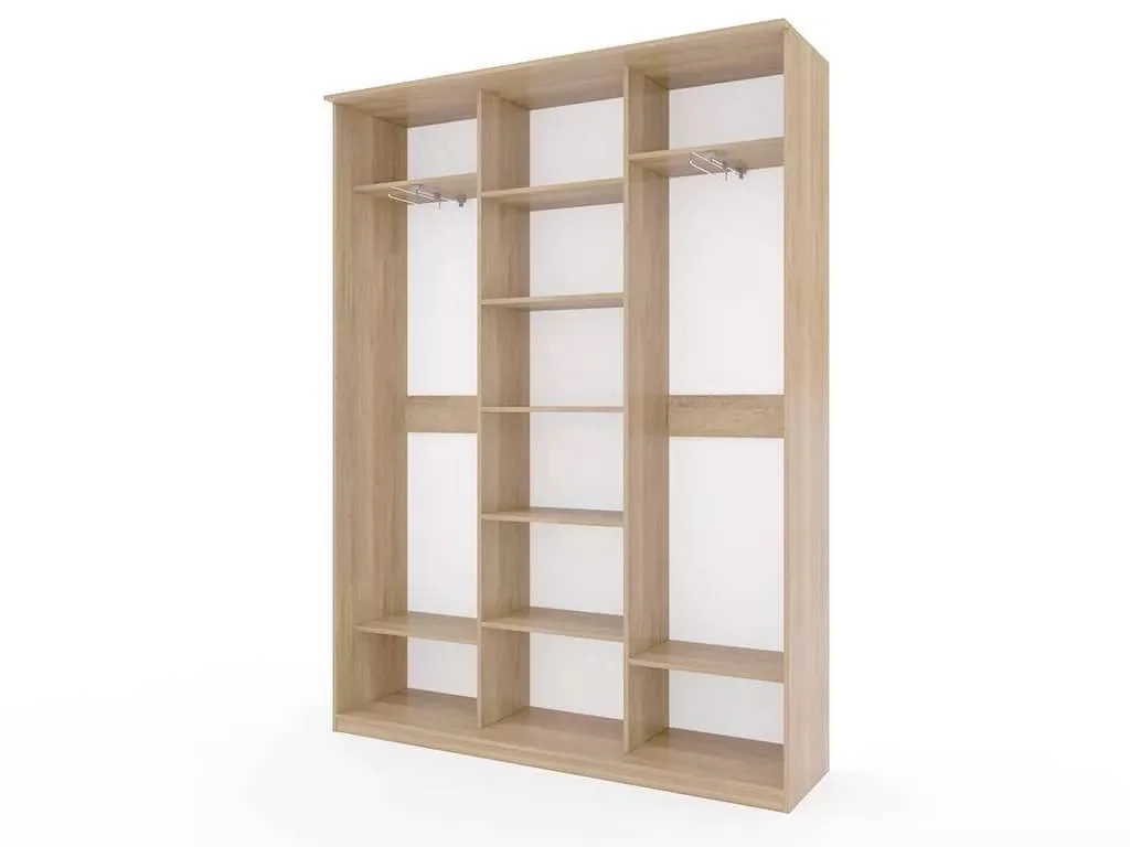 Шкаф оборудован 3-я глухими дверцами и одной с зеркалом, состоит из 3-х секций, в 2-х из которых по 6 полок, а в другой 2 полки и одна вешалка для плечиков с одеждой.