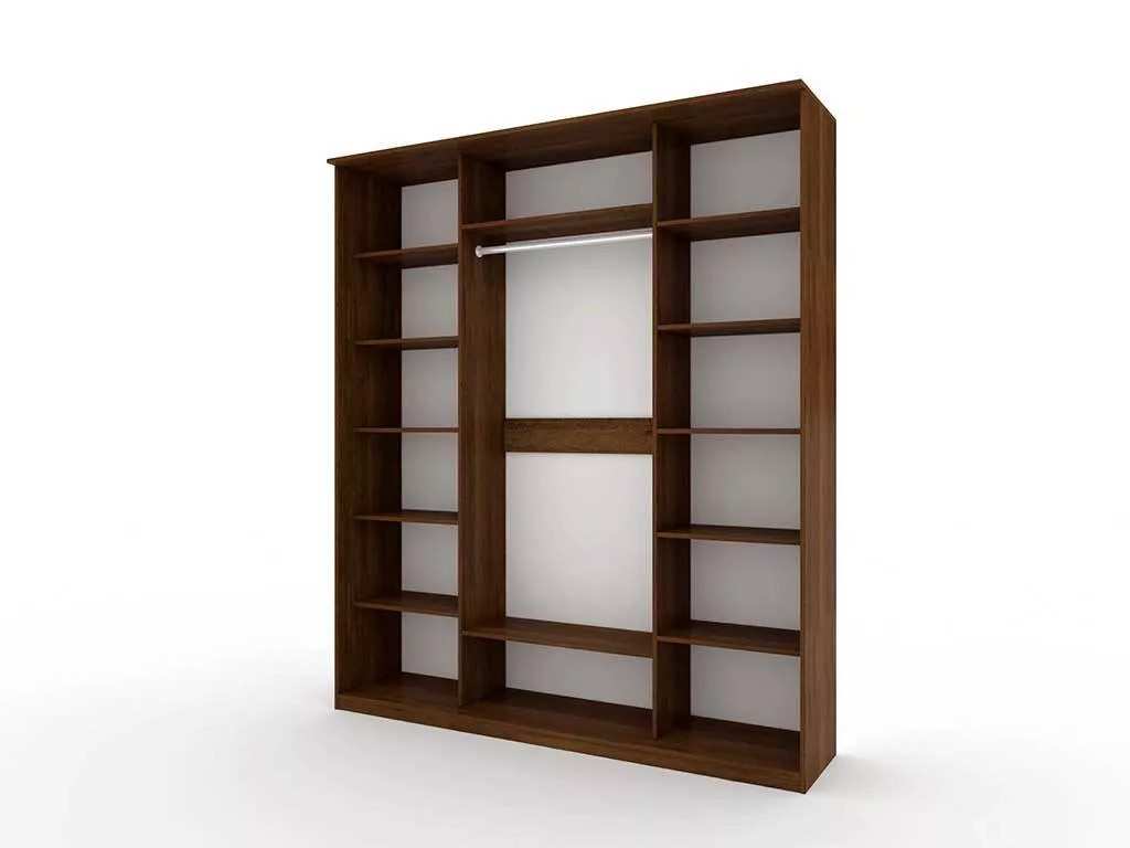 Шкаф оборудован 2-я глухими дверцами и одной с зеркалом, состоит из 3-х секций, в 2-х из которых по 6 полок, а в другой 2 полки и одна штанга для вешалок с одеждой.