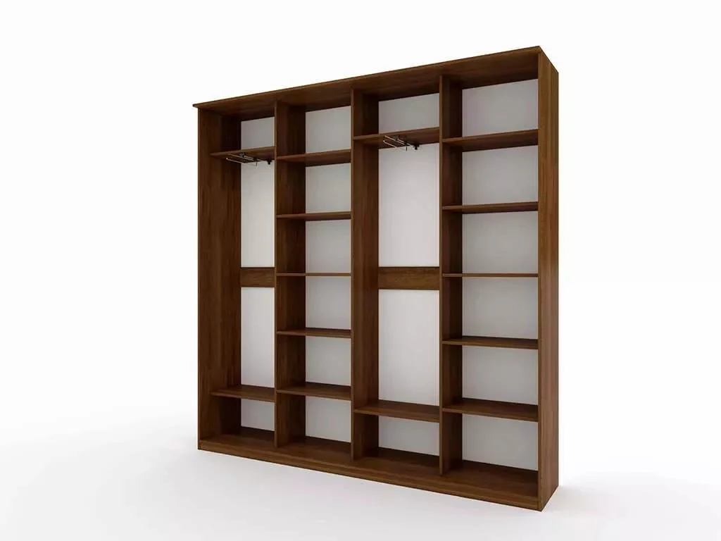 Шкаф оборудован 4-я дверцами с фотопечатью, состоит из 4-х секций, в 2-х из которых по 6 полок, а в 2-х других по 2 полки и одной вешалке для плечиков с одеждой.