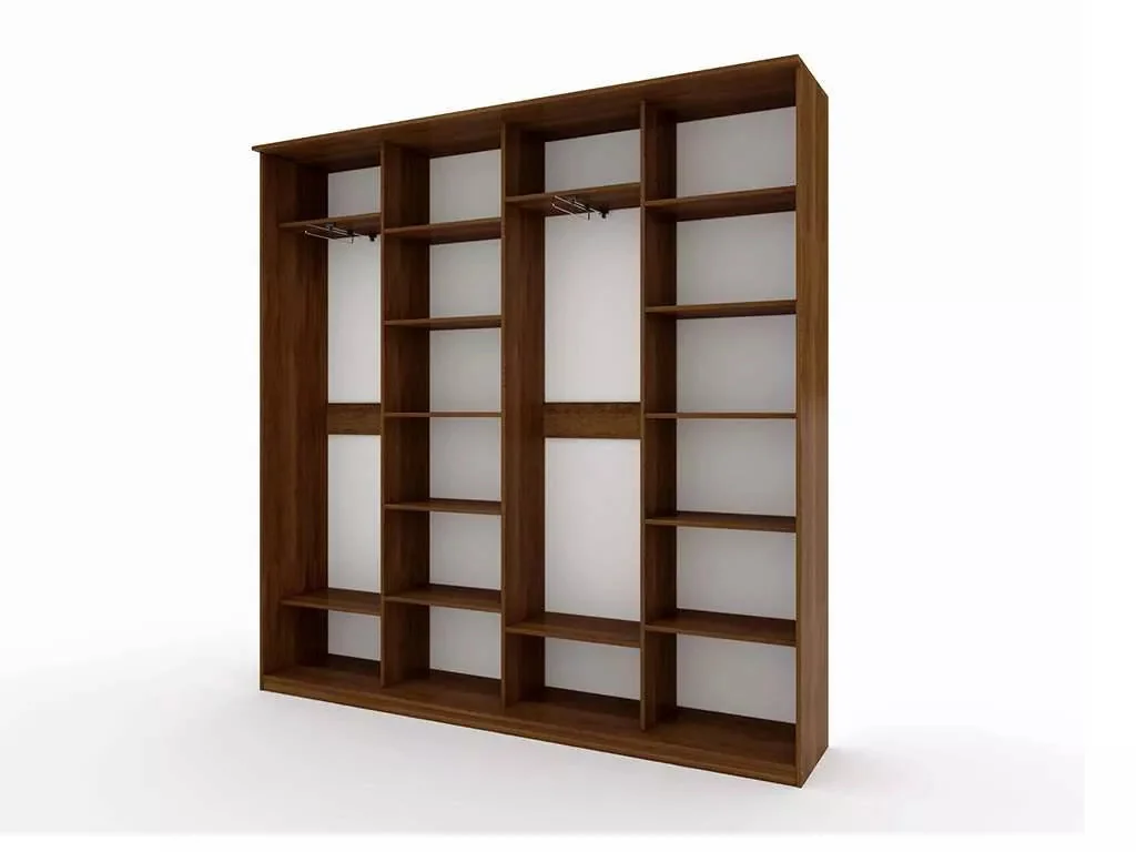Шкаф оборудован 4-я глухими дверцами, состоит из 4-х секций, в 2-х из которых по 6 полок, а в 2-х других по 2 полки и одной вешалке для плечиков с одеждой.
