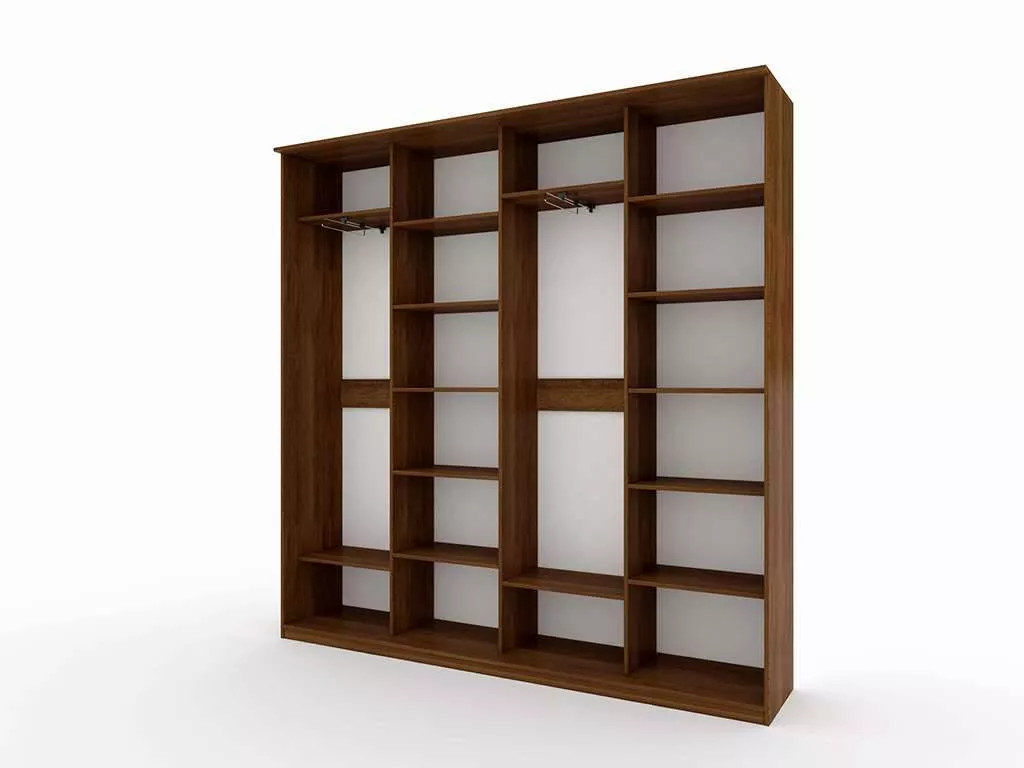 Шкаф оборудован 4-я глухими дверцами, состоит из 4-х секций, в 2-х из которых по 6 полок, а в 2-х других по 2 полки и одной вешалке для плечиков с одеждой.