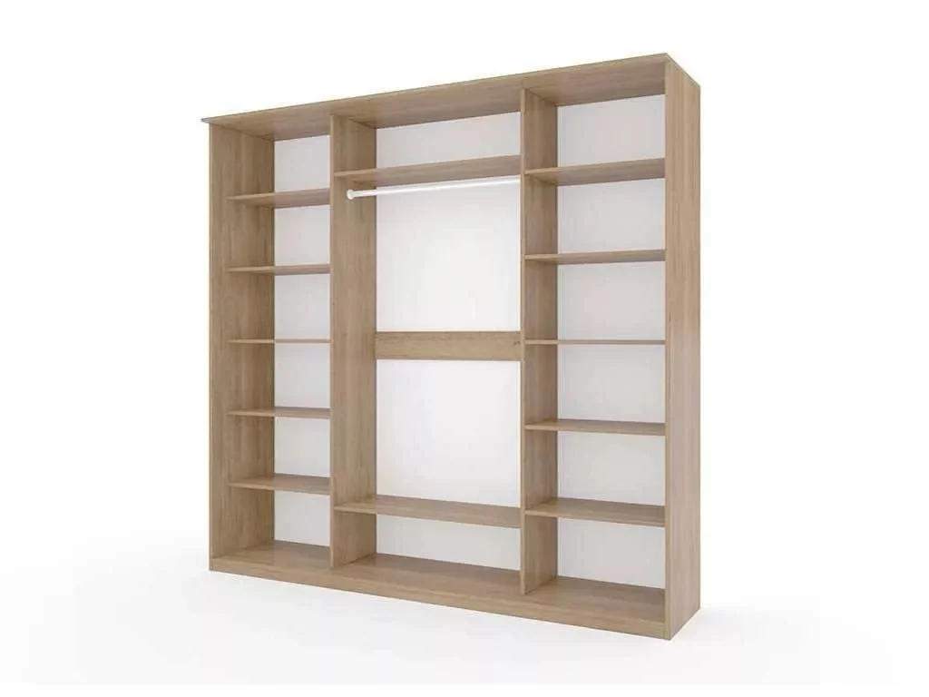 Шкаф оборудован 4-я дверцами с фотопечатью, состоит из 3-х секций, в 2-х из которых по 6 полок, а в другой 2 полки и одна штанга для вешалок с одеждой.