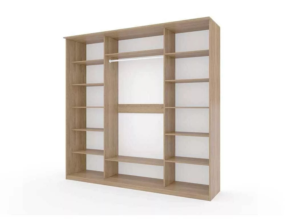 Шкаф оборудован 4-я дверцами, глухими и зеркальными, состоит из 3-х секций, в 2-х из которых по 6 полок, а в другой 2 полки и одна штанга для вешалок с одеждой.