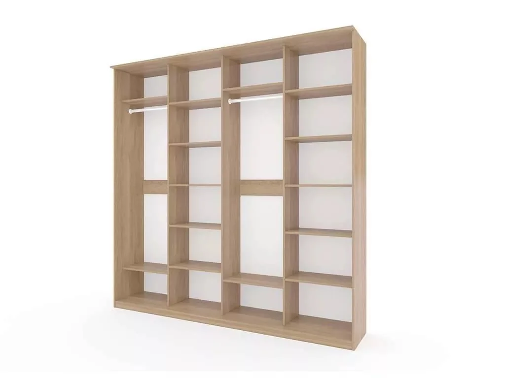 Шкаф оборудован 4-я дверцами с фотопечатью, состоит из 4-х секций, в 2-х из которых по 6 полок, а в 2-х других по 2 полки и одной штанге для вешалок с одеждой.