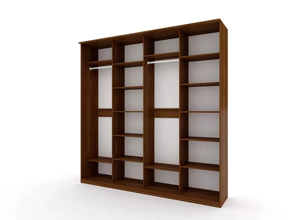 Шкаф оборудован 4-я дверцами с зеркалом, состоит из 4-х секций, в 2-х из которых по 6 полок, а в 2-х других по 2 полки и одной штанге для вешалок с одеждой.