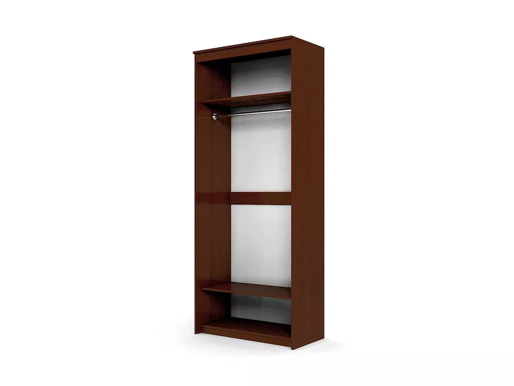 Шкаф оборудован двумя глухими дверцами, двумя полками и металлической горизонтальной вешалкой для плечиков с одеждой.